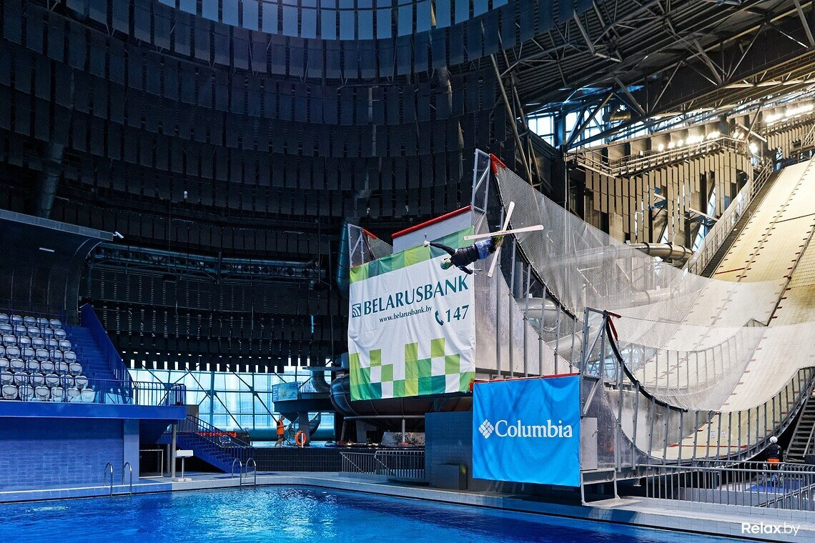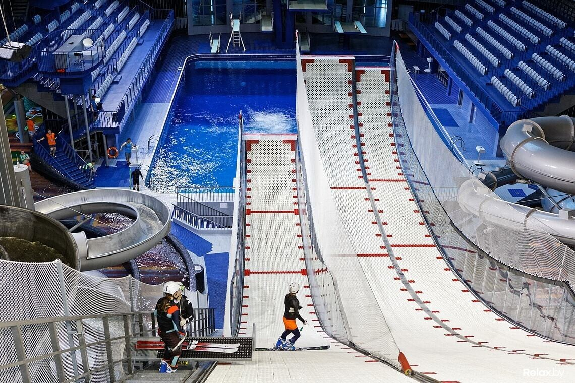 Кроме отдыхающих, в аквапарке можно встретить спортсменов. Сегодня здесь занимаются корейские фристайлисты. Наверное, круто съезжать на лыжах с такой высоты. Но, увы: сюда пускают только профессионалов, потому что очень опасно. Впрочем, со стороны тоже интересно понаблюдать за спортсменами. Шоу получается зрелищное и бесплатное.