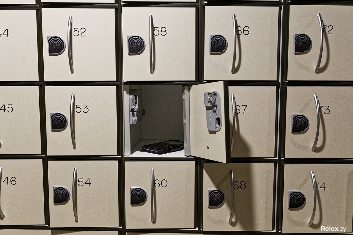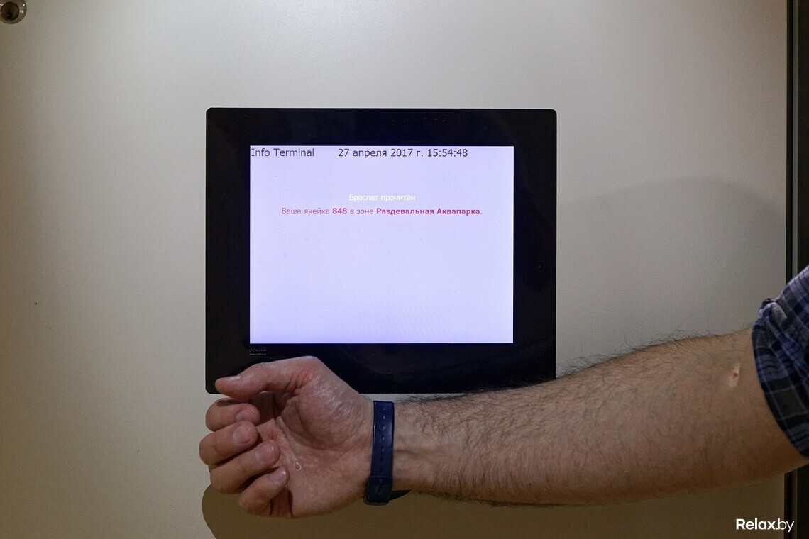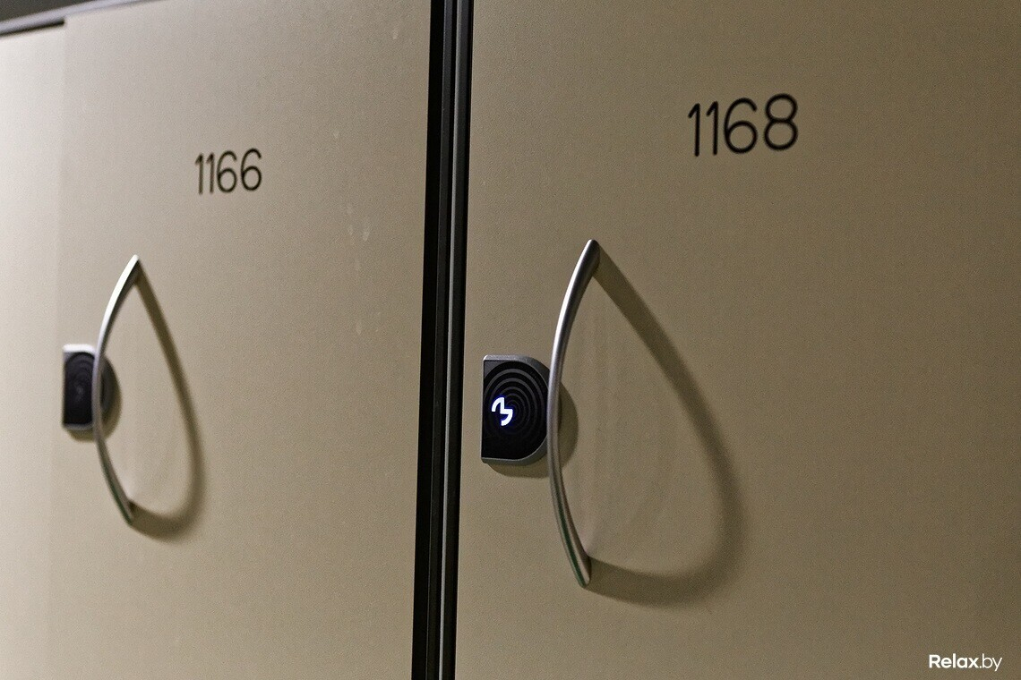 Уличную одежду, обувь и ценные вещи оставляют в шкафчиках. Прикладываете браслет — и ваша собственность оказывается под замком и неусыпным взглядом камер наблюдения.