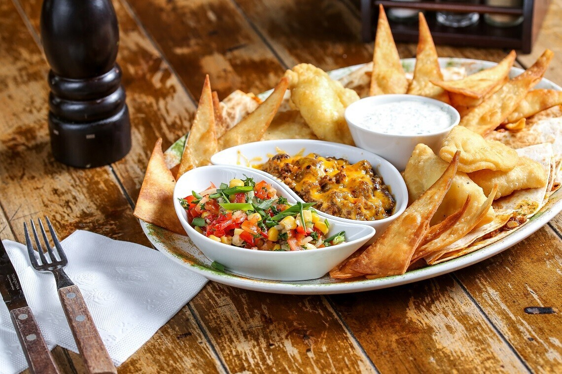 2. Сборная тарелка «Фэст» (ушки запеченные, сулугуни в кляре, крылья, куриный «Попкорн»)