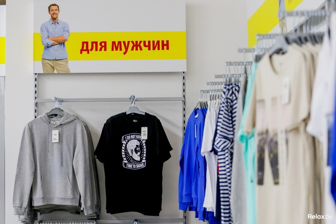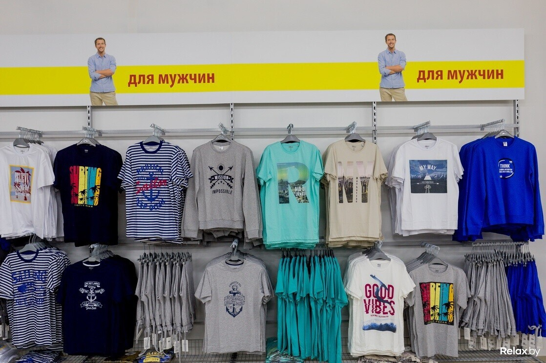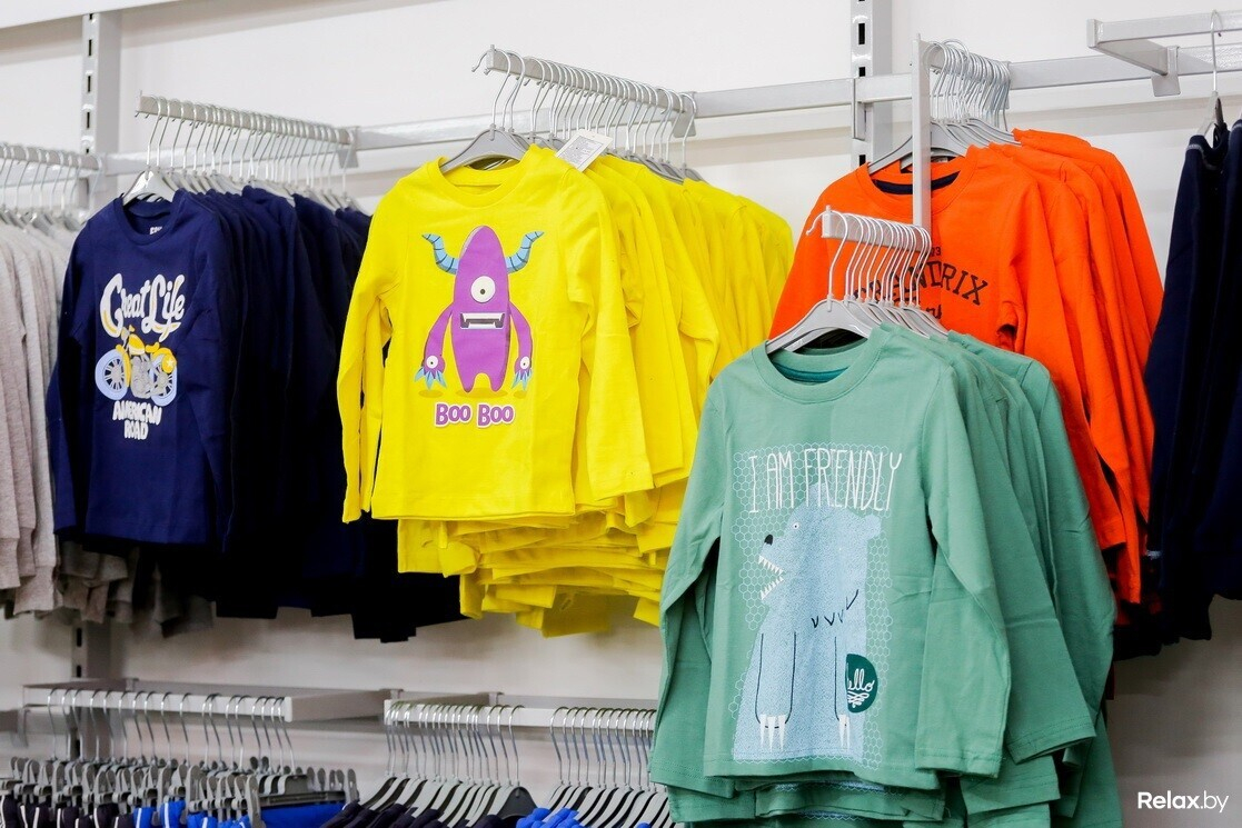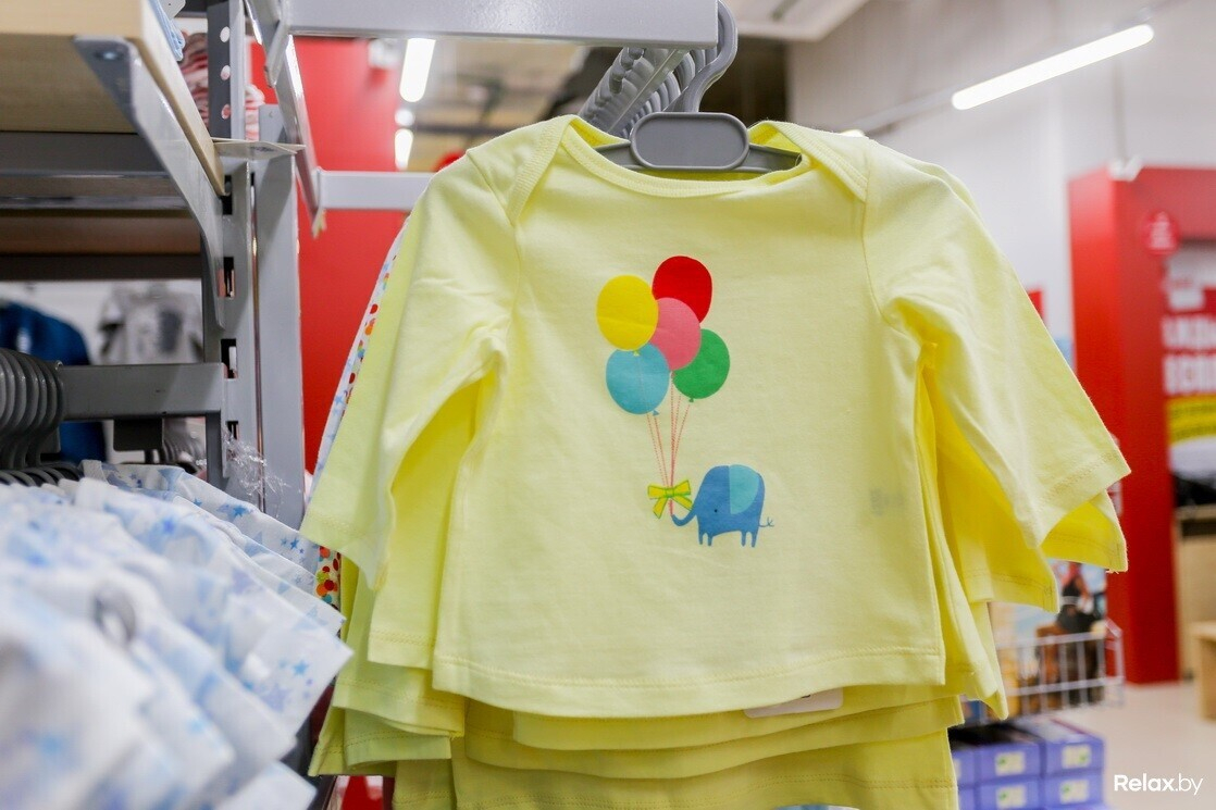 Среди вещей для малышей — верхний и нижний трикотаж: комбинезоны, кофты, штаны (есть, кстати, и аксессуары вроде пустышек, бутылочек и детской посуды). Детям постарше предлагают брюки, джемперы, фуфайки, футболки, майки, белье (а девочкам еще леггинсы и ночнушки). Женщины и мужчины найдут на стеллажах брюки и джемперы спортивного стиля, большой выбор футболок (базовых и с забавными принтами). А еще чулки и носки для всех.
