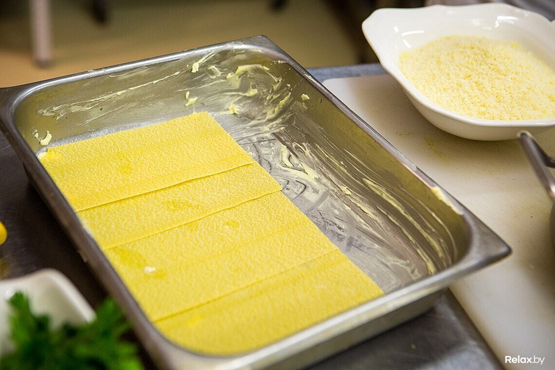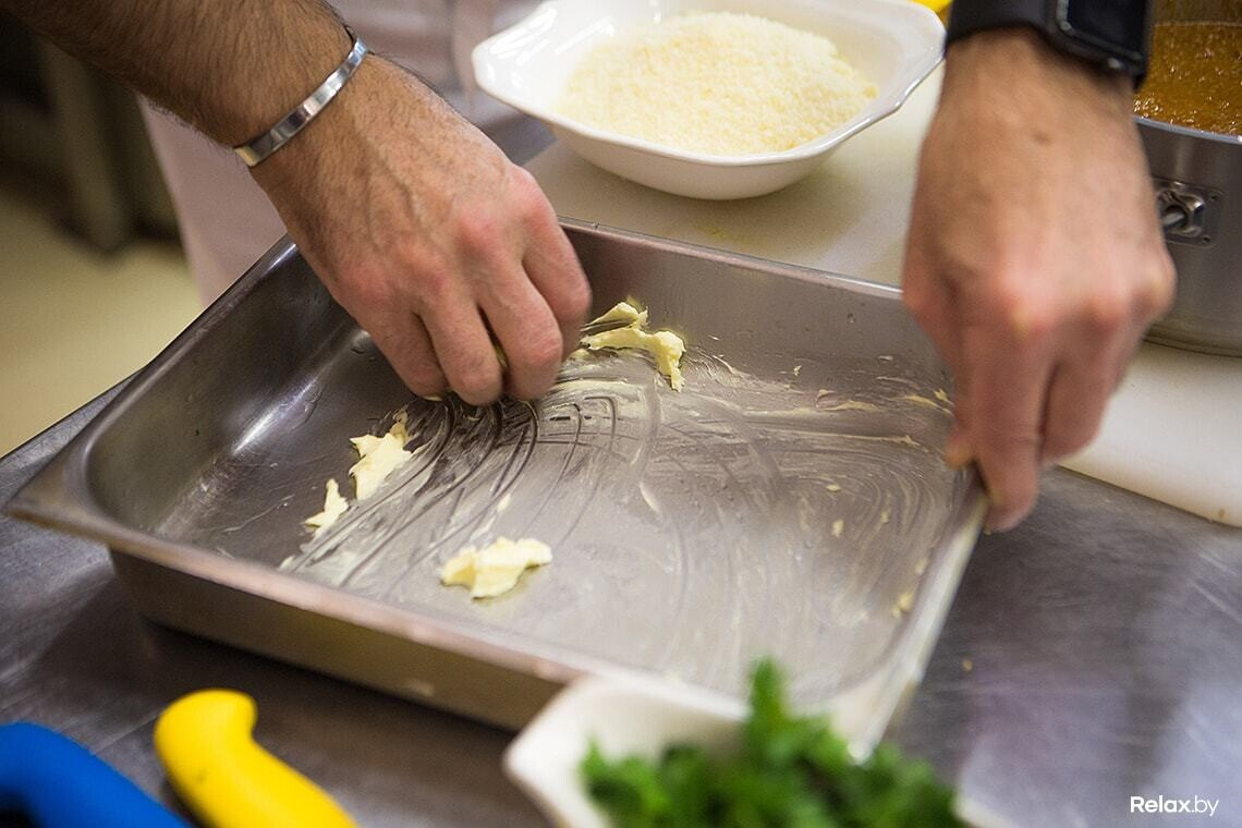 Противень (в том числе, и бортики) шеф-повар смазывает сливочным маслом, чтобы впоследствии блюдо не пристало к посуде. Для лазаньи лучше выбрать квадратный противень с явными углами; если такого нет ― обломайте края листов теста, чтобы те плотно примыкали к стенкам и умещались в форму.