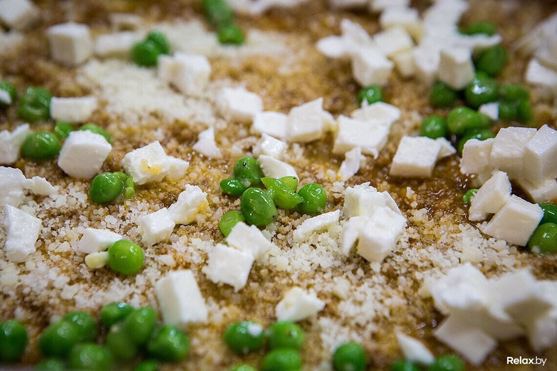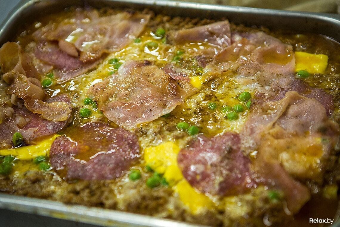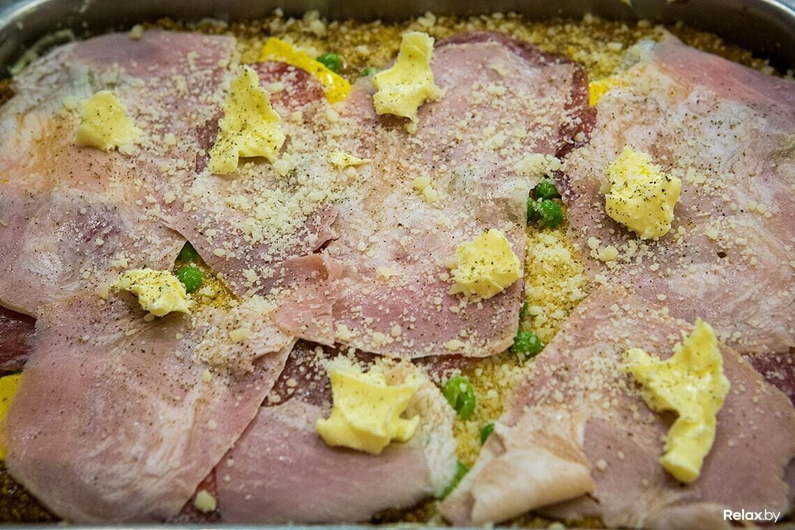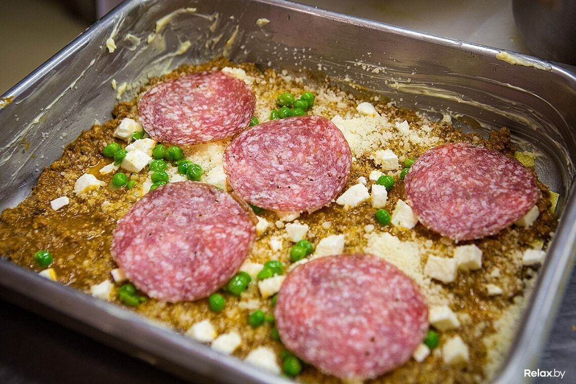 Распределив Болоньезе, дополняем слой остальными ингредиентами: итальянец укладывает на мясной соус сыр моцарелла, нарезанный мелкими кубиками, тертый пармезан, горох, тонкие слайсы салями и ветчины, порванный на кусочки сыр для бургеров и щедро посыпает слой свежемолотым перцем из «мельницы»: говорит, сицилийская кухня ― весьма пикантная. Последний штрих ― небольшие кусочки сливочного масла, поскольку из-за своего мясного состава рагу получилось не слишком жирным.
