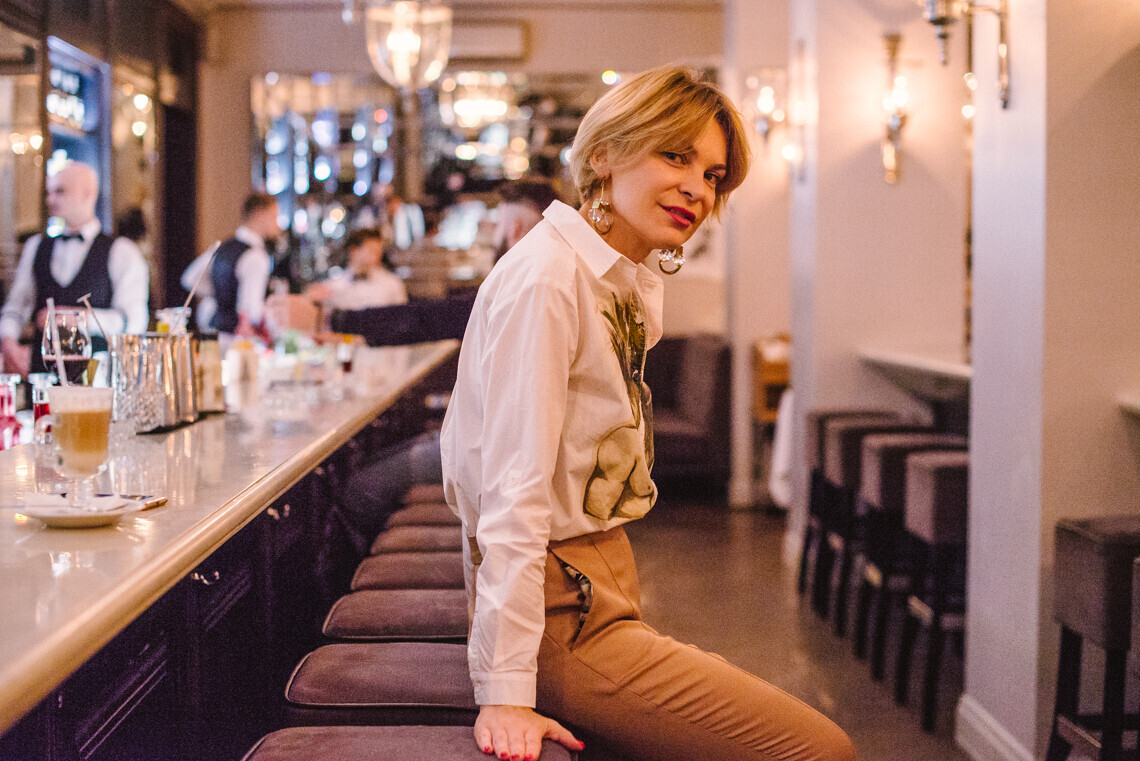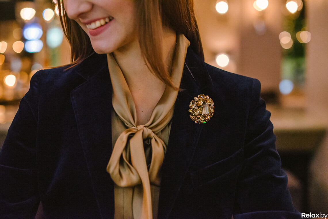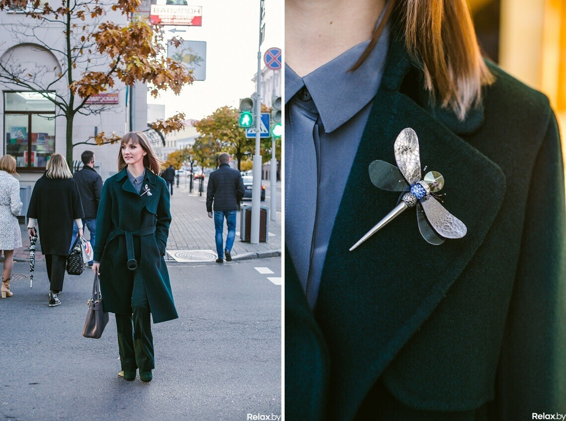 — Подсказка: чтобы сделать повседневный офисный комплект интересным и нескучным, берем классическую рубашку и пальто, добавляем модные брюки-клеш, немного игры фактуры (шелка и вельвета) и палитру из двух дорогих, сложных оттенков. Чтобы сделать образ немного менее строгим, мы добавили на лацкан пальто Юлии легкую стрекозу, которую нашли в шоу-руме A La Lounge.