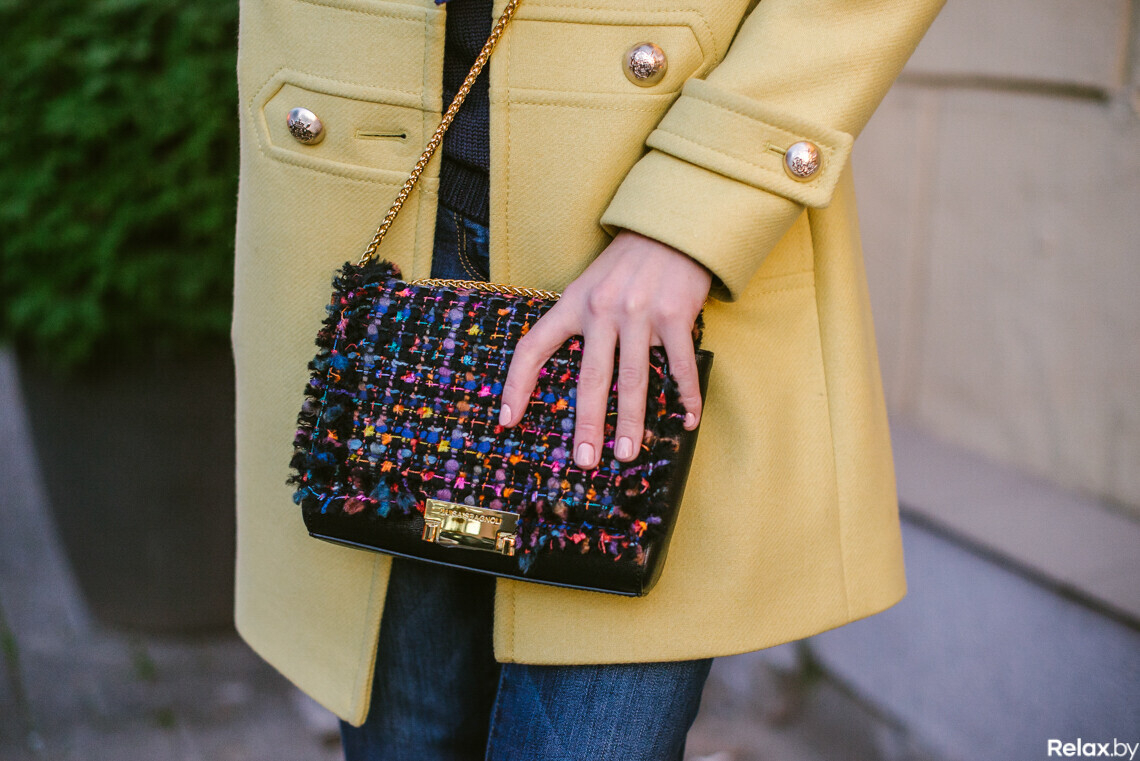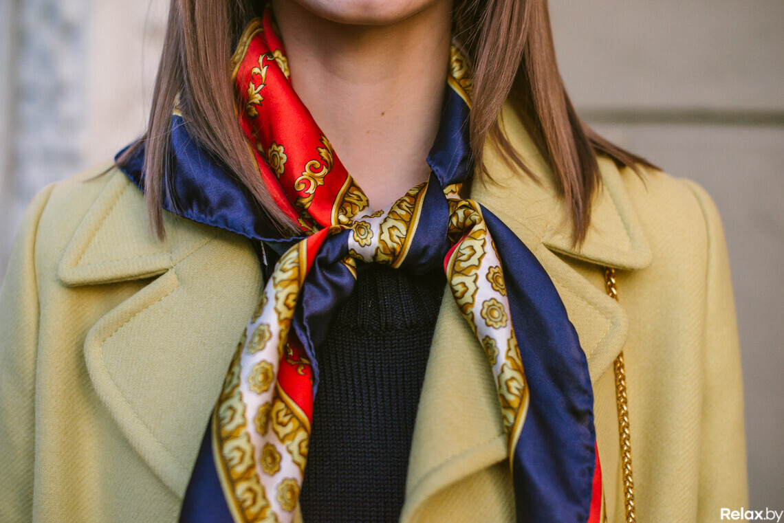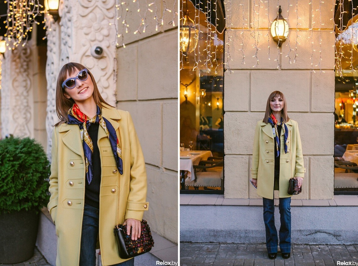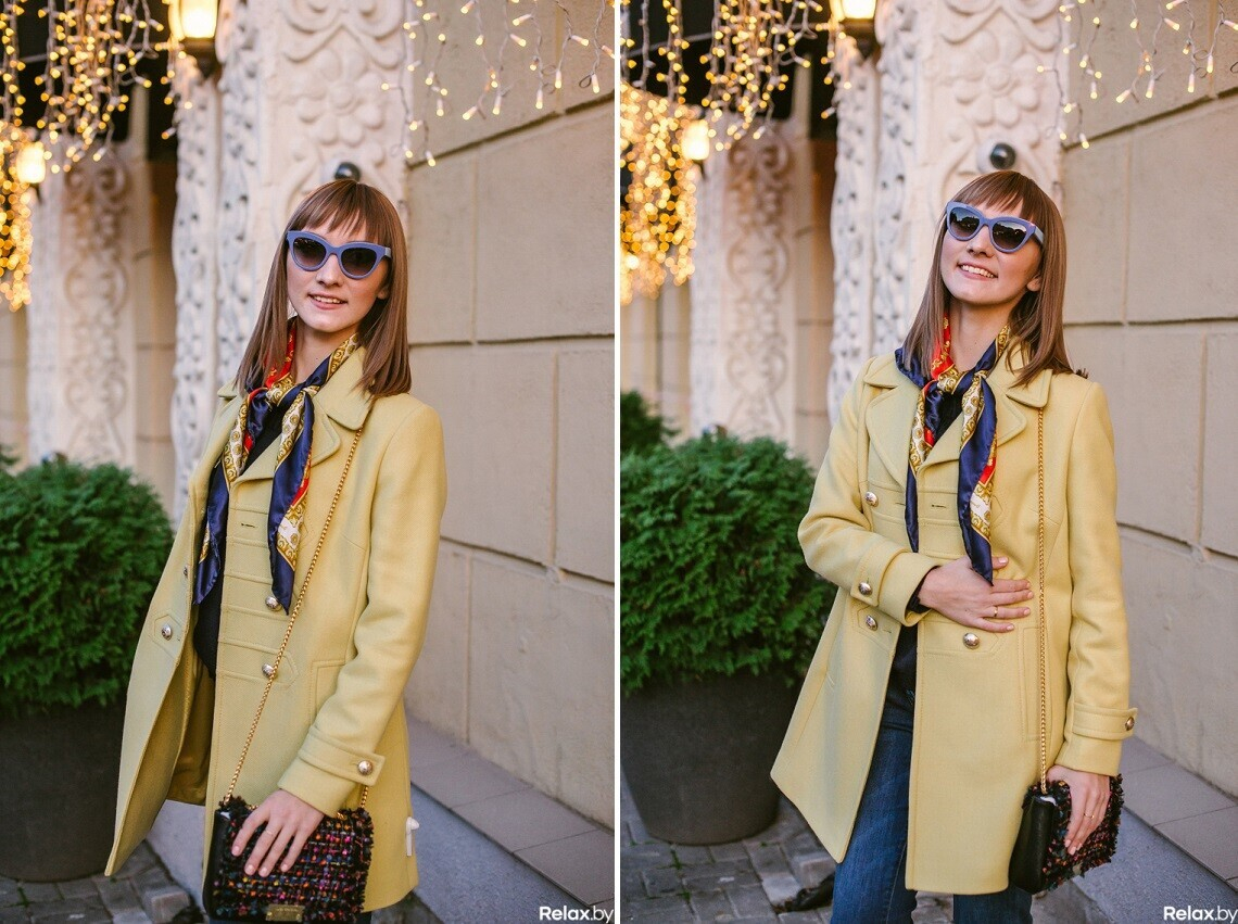 — Элементы военно-морской атрибутики в виде застежки и золотых пуговиц на пальто задали настроение — в образе появился дух романтики и морских приключений. Мы подхватили этот настрой и добавили платок с соответствующим принтом и задорную сумочку.