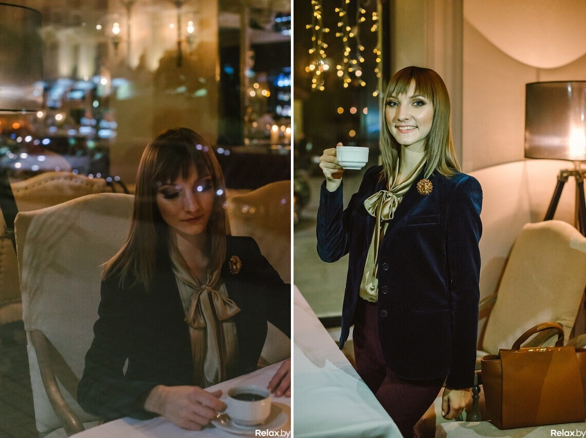— Темно-синий бархатный пиджак и блуза из золотистого атласа — изысканный аристократический шик выдержит не каждая внешность. Но Юлия в новом образе так органично вписалась во всю эту элегантную роскошь, что ей можно позавидовать. Съемка проходила в подходящем для такого образа месте — в Cafe De Paris.