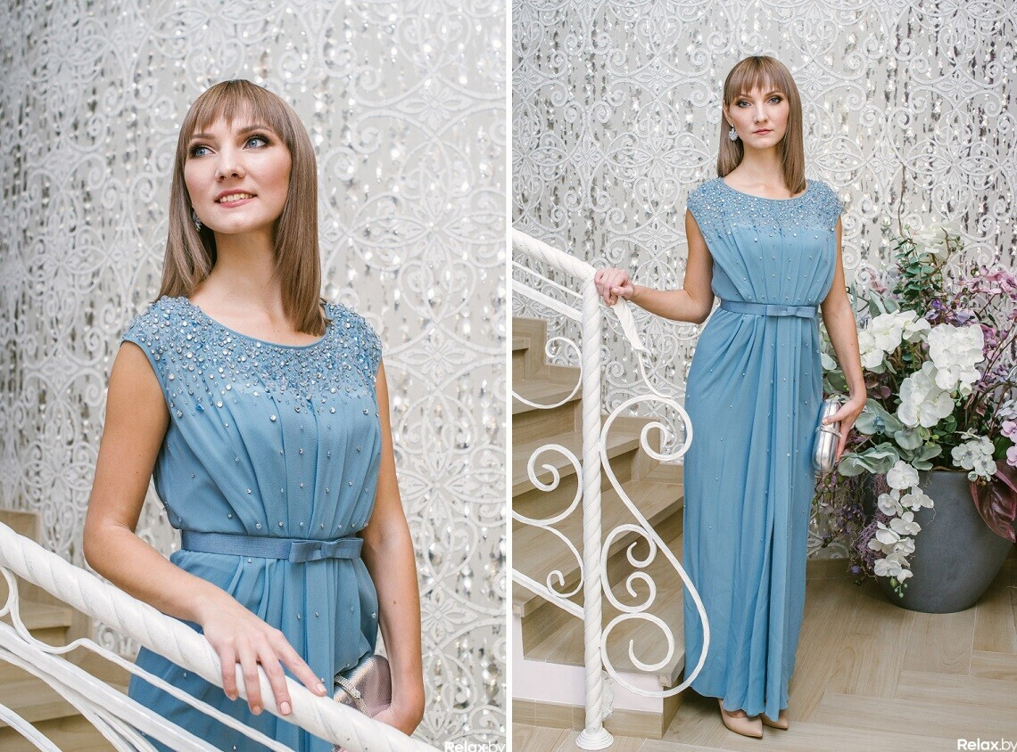 — Это вечернее платье идеально подходит Юлии по колориту: приглушенно-голубое, декорированное стеклярусом, похожим на тающие льдинки. Кстати, прозрачный декор (стеклярус, пластик) — один из трендовых в этом сезоне.