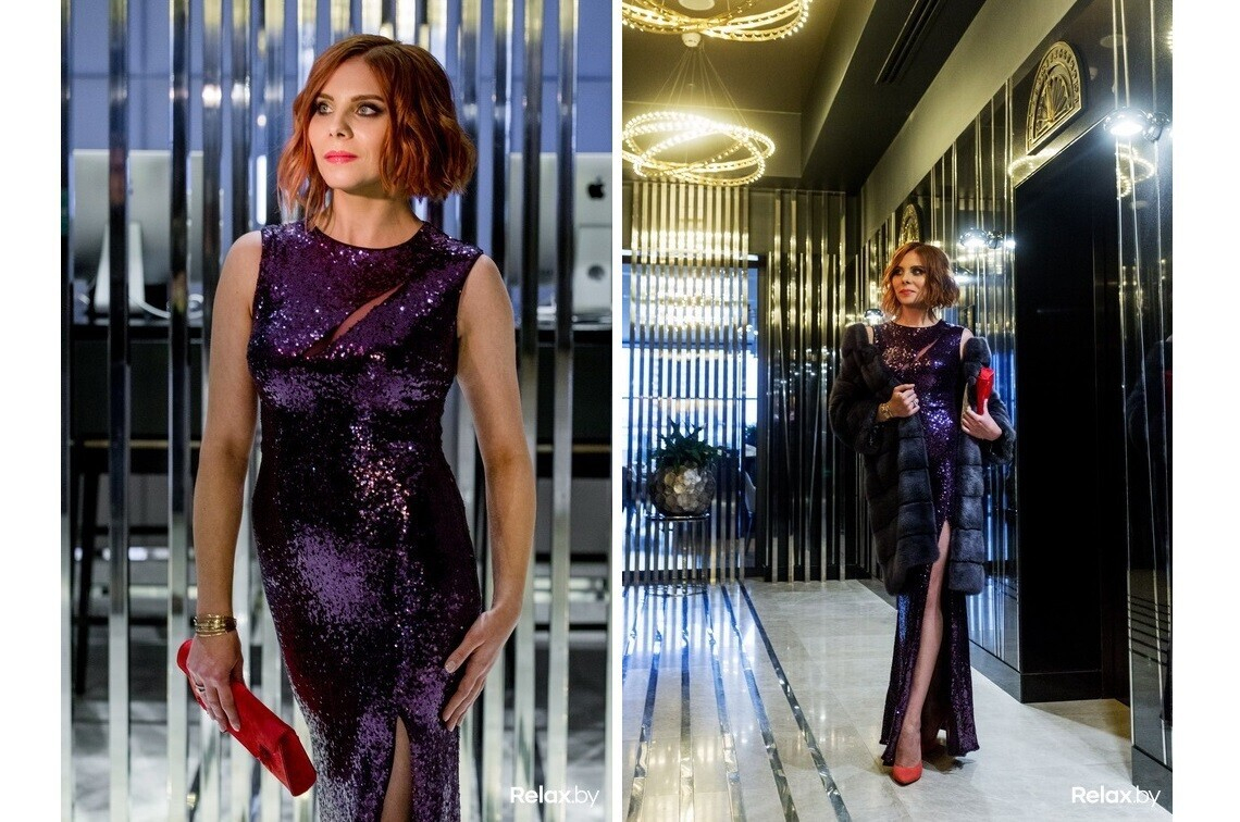 — Образ эдакой голливудской дивы так и просится блистать на пышном новогоднем корпоративе. Для него выбрали платье в пол в пайетки актуального фиолетового цвета (надевая такое, всегда помните про правильно подобранное белье, которое в некоторых случаях должно быть корректирующим). На его фоне также важно не потеряться, так что мы поддержали его трендовыми небрежными локонами и макияжем с акцентом на губы (с легким сиянием).
