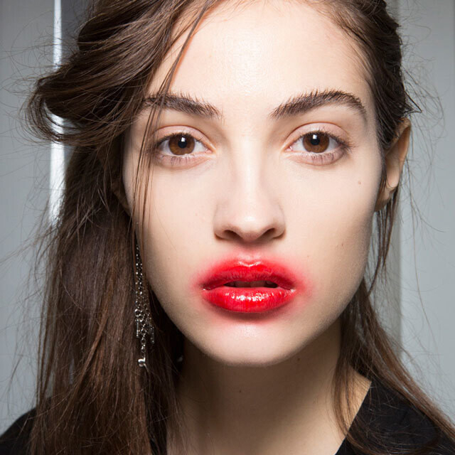 Этот тренд уже признали самым соблазнительным в 2018 году. Эффект «зацелованных» губ мы наблюдали на показах Giambattista Valli, KENZO и Clarins: ярко-красные, темно-бордовые или вишневые, они однозначно приковывают взгляд и выглядят необычно. А все потому, что контур губ намечать не нужно, достаточно использовать помаду и размыть его с помочью щетки или просто пальцем.
