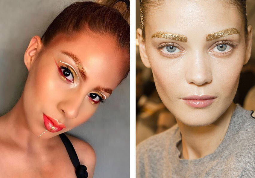 Регулировать интенсивность мерцания можно самостоятельно: смешайте прозрачный гель для бровей с тенями оттенка «бронза»/«медь», а затем нанесите на брови пальцем или кисточкой. В качестве клейкой основы также можно использовать вазелин. В отличие от «зацелованных» губ, здесь выход блесток за границу бровей будет считаться неуместным, поэтому лучше сделать четкую линию и красивую бровь, потратив на это больше времени.