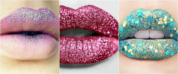 Этот макияж несложно сделать в домашних условиях. Необходимо накрасить губы, а затем провести по ним пальцем, смоченным в блестки. Помаду в качестве основы лучше выбирать жидкую или глянцевую, чтобы элементы декора не осыпались. Подкорректировать блестки по форме губ поможет пинцет или тонкая кисточка.