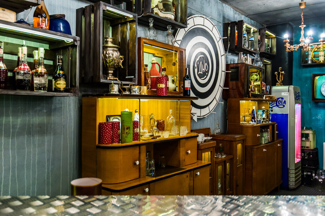 Слегка сумасшедший дизайн, дополненный старой мебелью и декором, получился странноватым. Но у владельцев и не было цели открыть ретро-бар. В помещении собралась этакая «Свалка веков», как в шутку называют интерьер бара они сами.