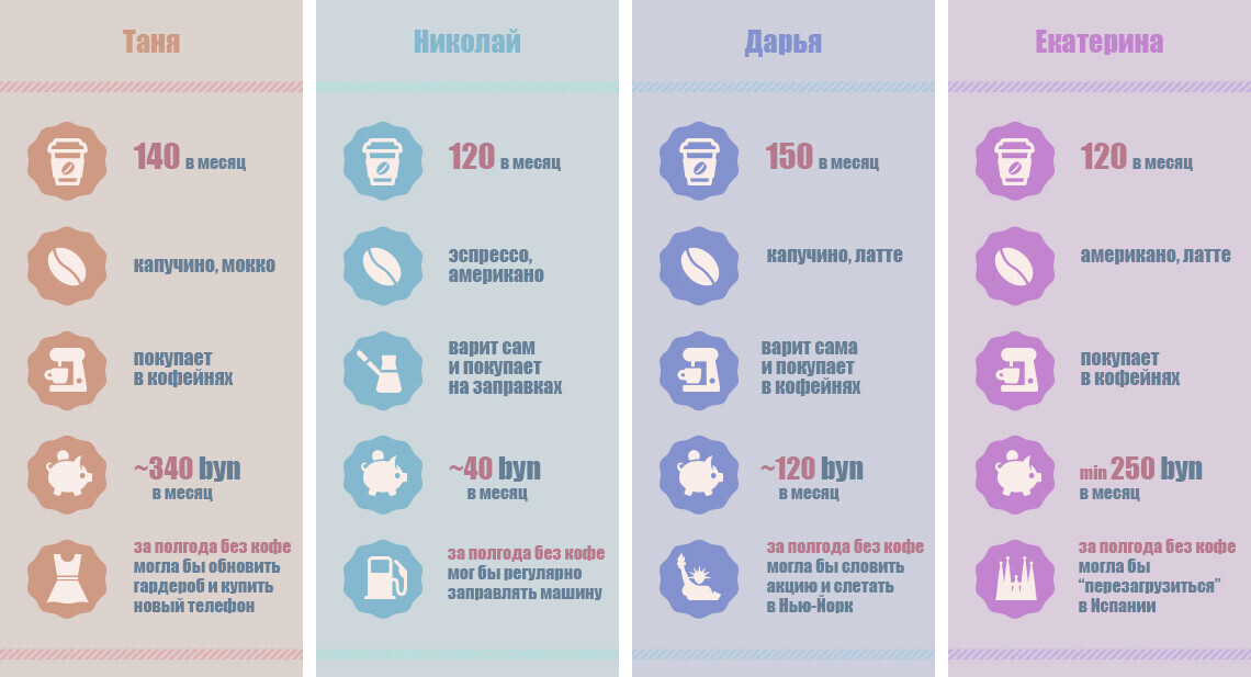 Кофе редко оставляет кого-то равнодушным. В то время как одни рассуждают о его вреде, называя зависимостью, другие уже не представляют без кофепаузы свой день, экспериментируют с экстремальными добавками или тратят на его покупку сотни рублей в месяц. Relax.by вместе с Respect нашел четырех кофейных маньяков, которые искренне любят напиток бодрости и уверены в том, что без него жизнь уже не будет прежней.