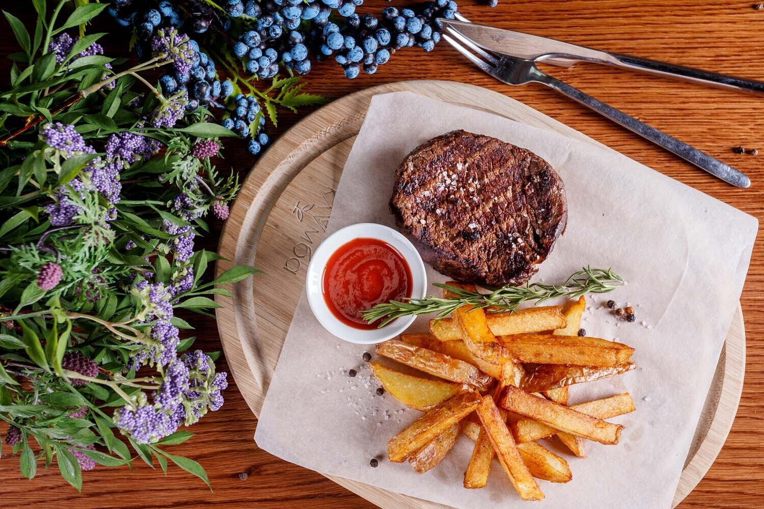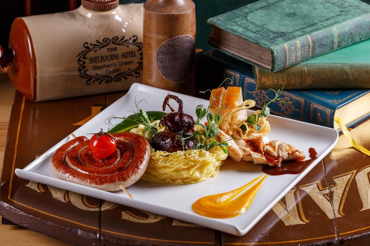 - Чампом из картофеля, соусом из темного пива, тыквенным и шпинатным пюре