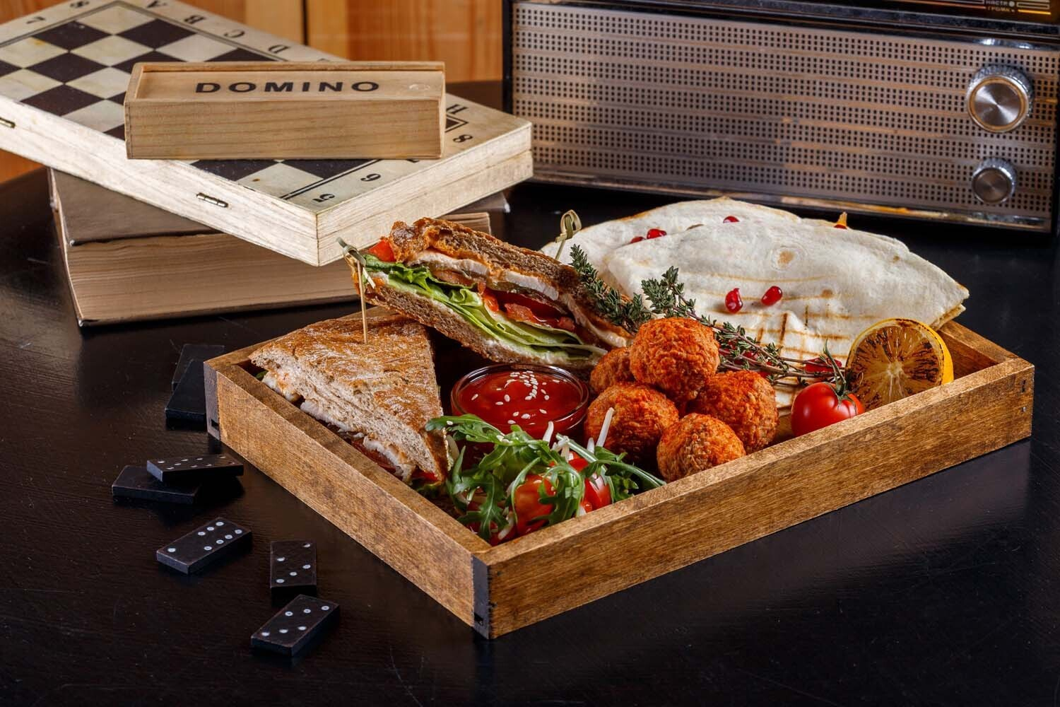 - Ржаная брускетта с тартаром из говядины и рукколой