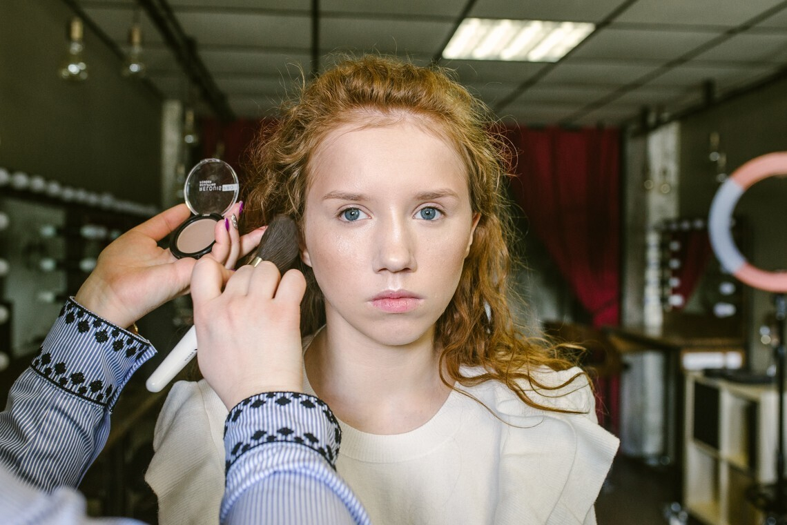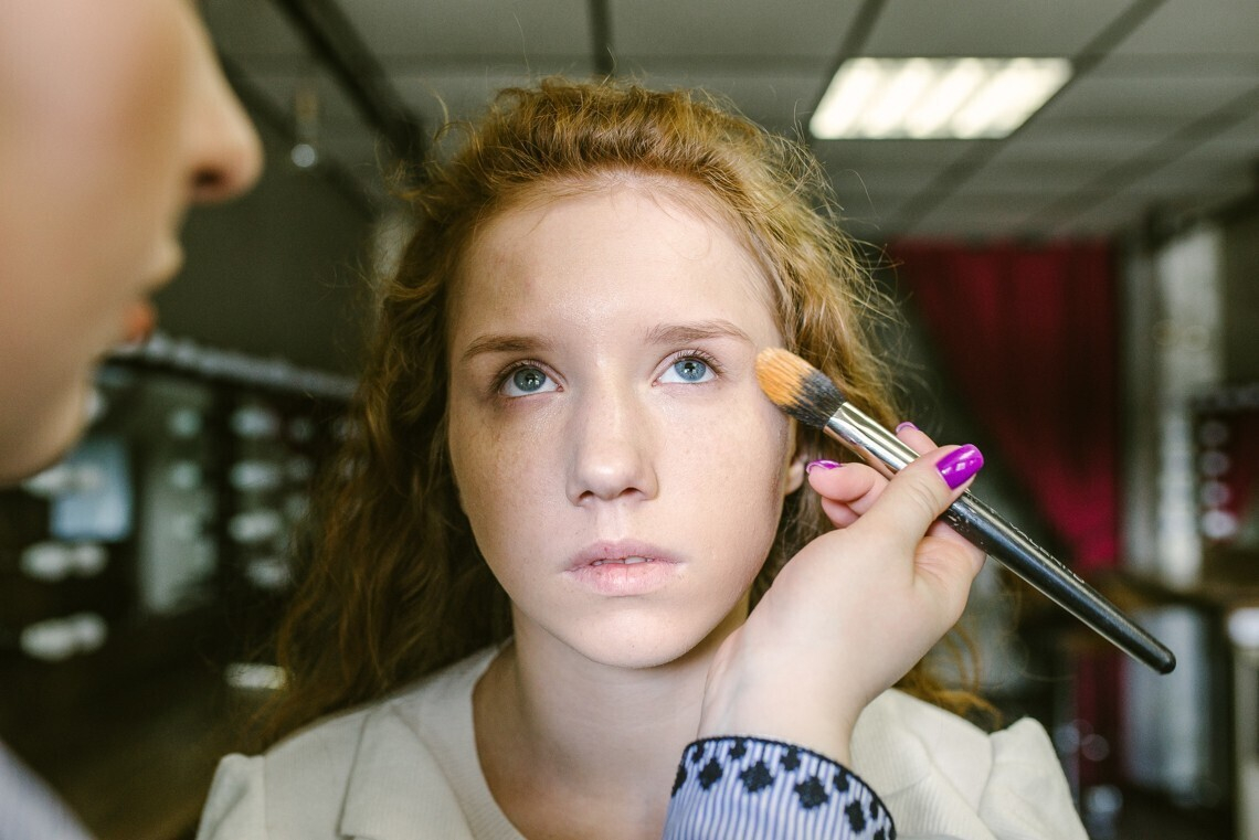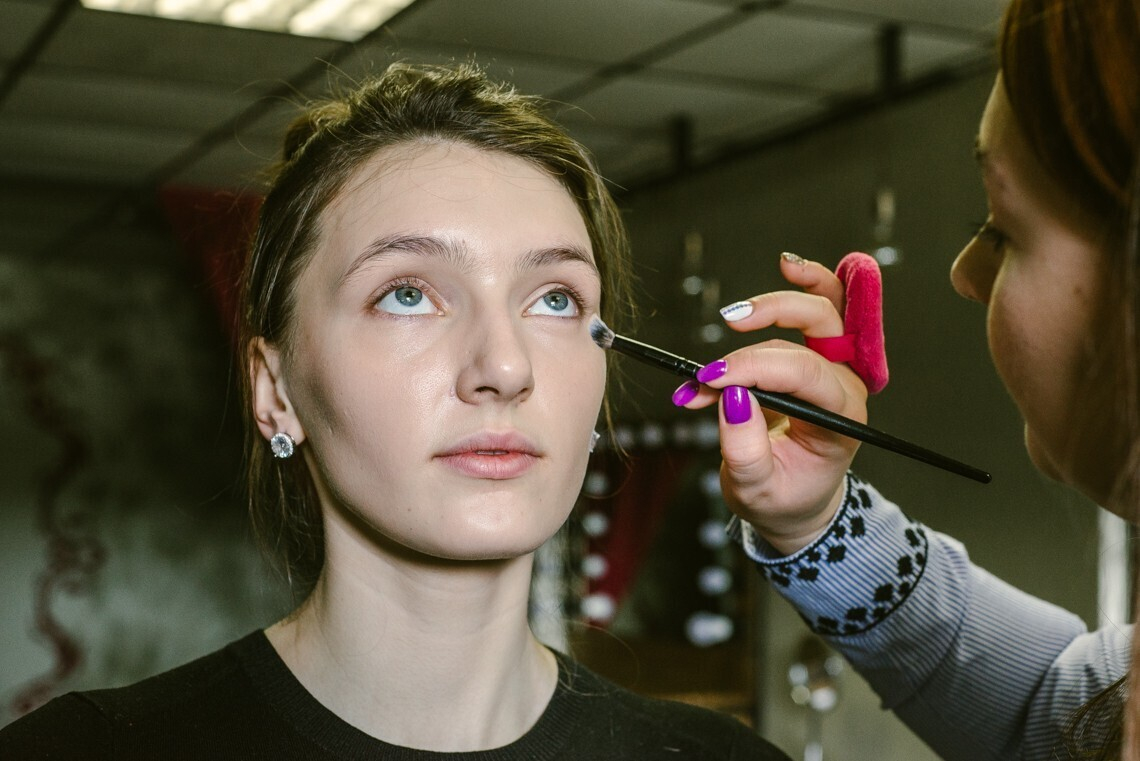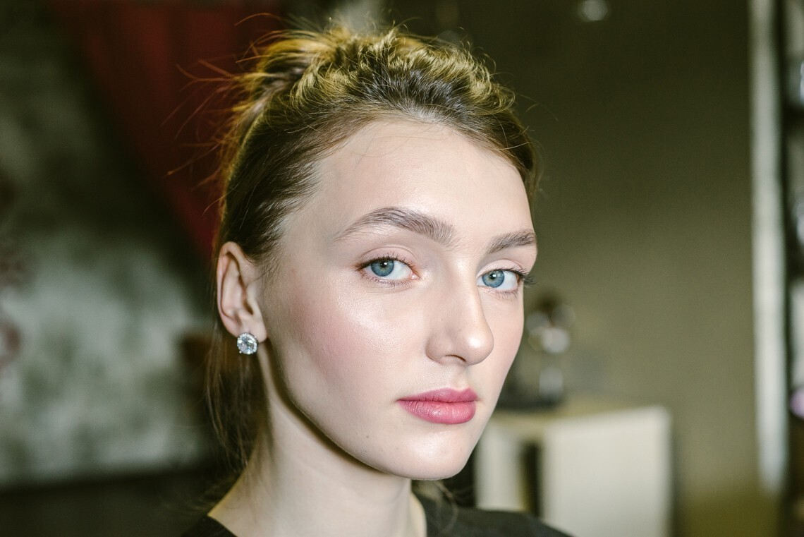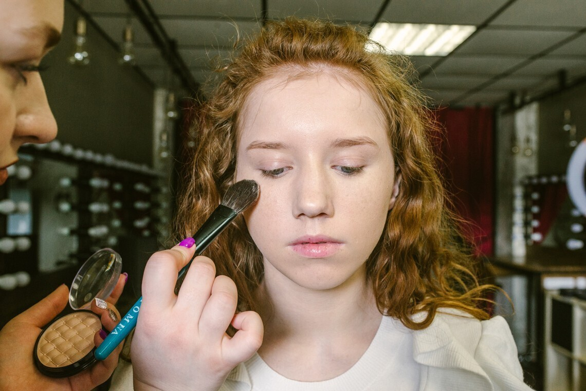 У Ани есть небольшой пушок на лице, поэтому хайлайтер мы выбираем кремовый, который эту особенность подчеркивать не будет. Муссовый хайлайтер распределяем на выступающих частях: верхняя часть скулы, над и под бровью, над губой.