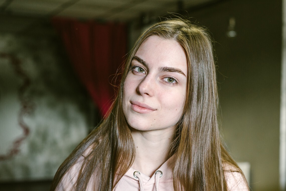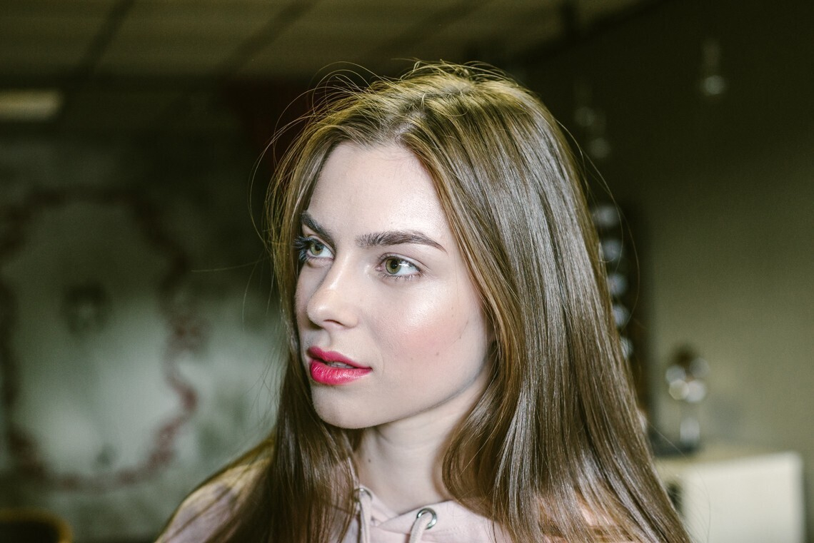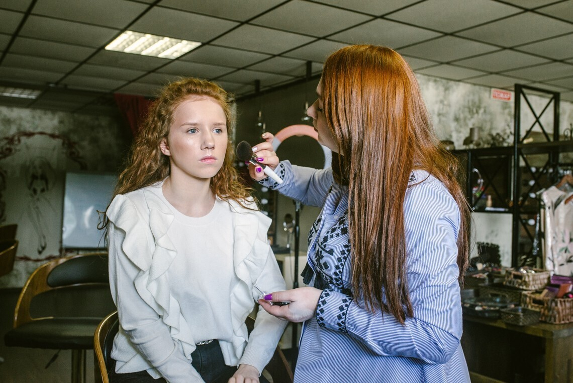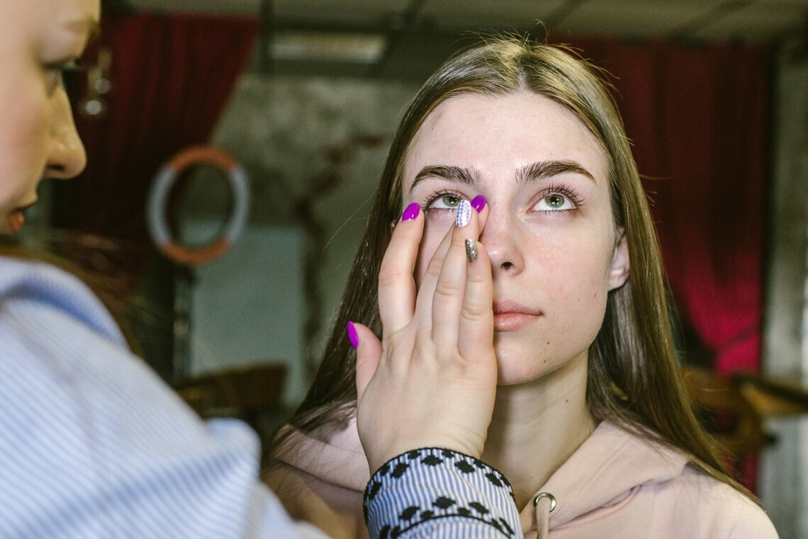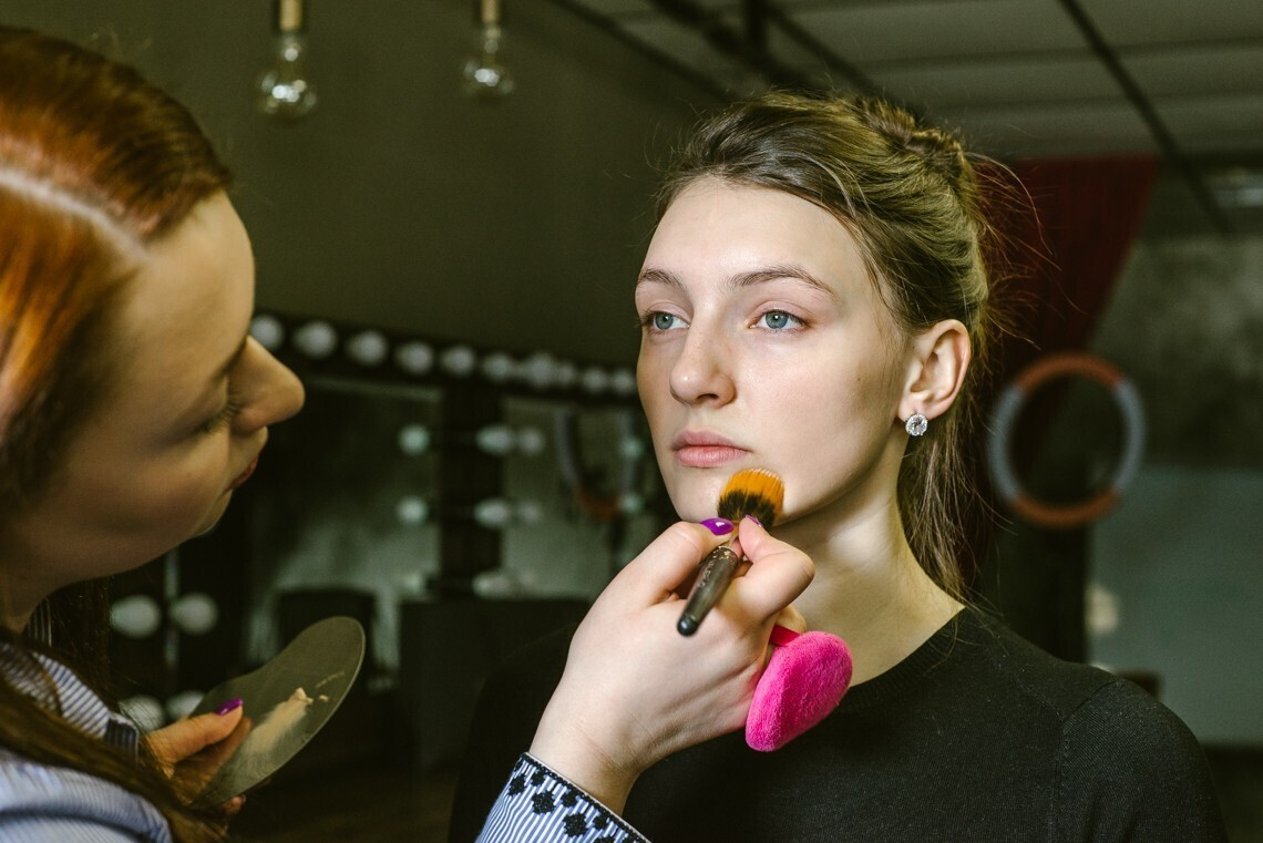 У Ани есть небольшой пушок на лице, поэтому хайлайтер мы выбираем кремовый, который эту особенность подчеркивать не будет. Муссовый хайлайтер распределяем на выступающих частях: верхняя часть скулы, над и под бровью, над губой.