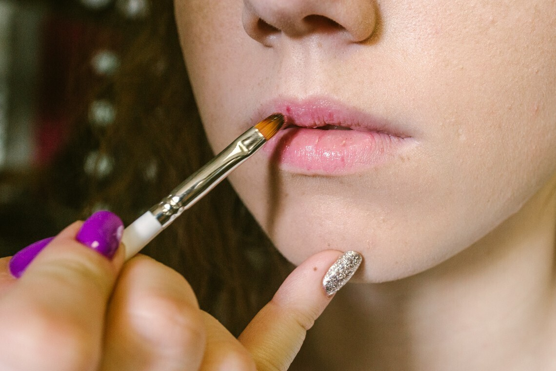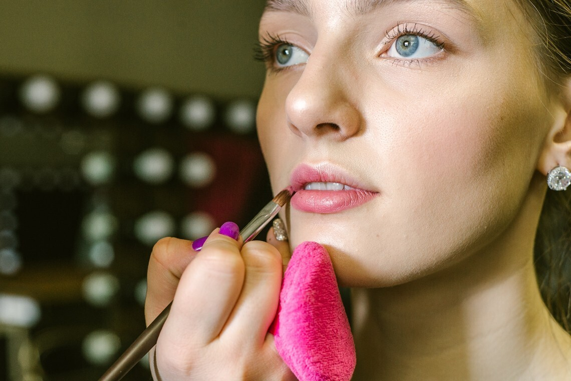На губы модели наносим увлажняющийоттеночный бальзам, чтобы напитать их влагой и сделать образ нежнее. Мы выбрали виноградный бальзам, который уходит в розово-красный цвет. Наносим его от центра, стушевывая края.