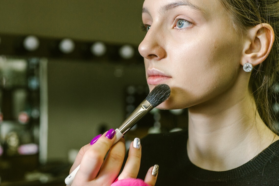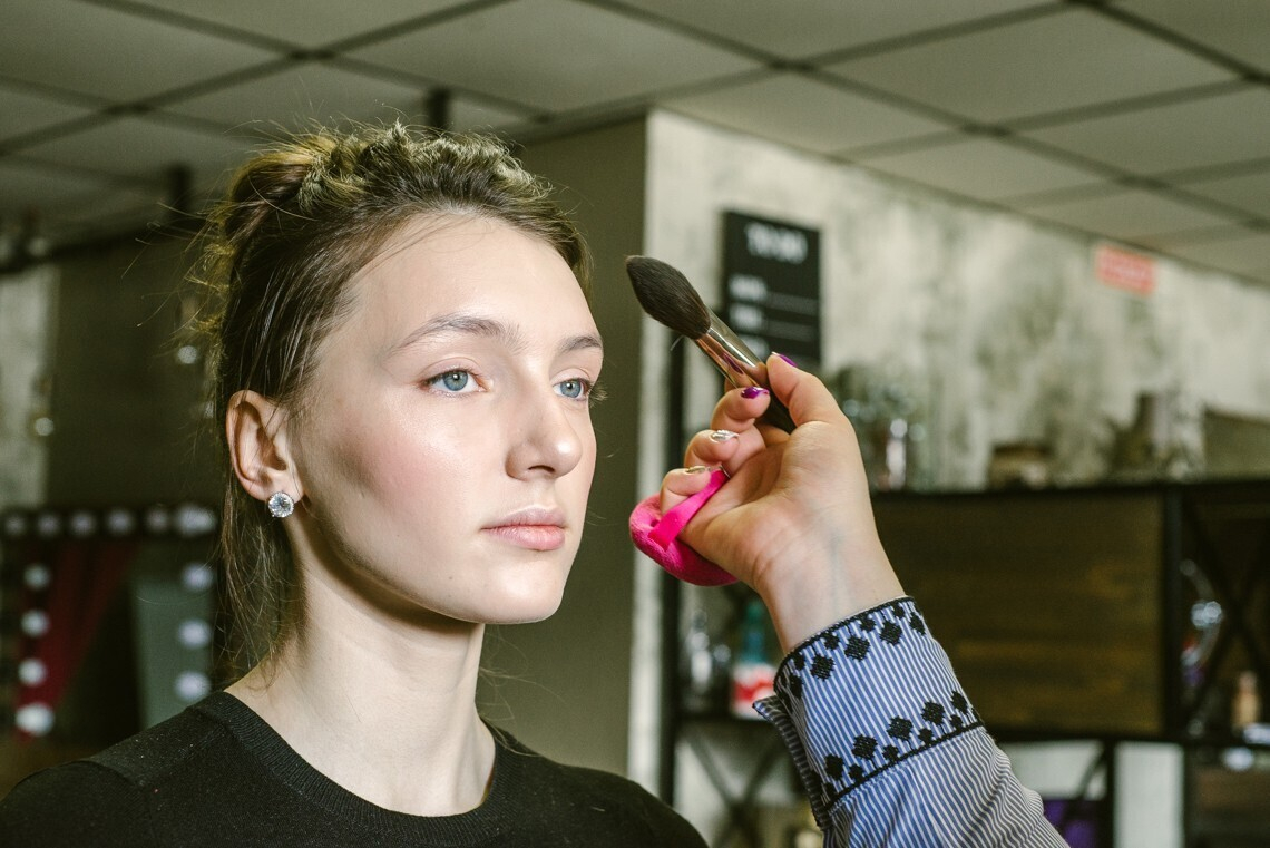 Для Саши мы выбрали скульптор светлого серо-коричнего цвета, так как насыщенные темные оттенки на ее кожи выглядели бы неестественно. Заранее припудриваем зону щёк, чтобы продукт не лёг пятнами. Набираем немного скульптора и кладем его над (!) впадинами вдоль щек и на височную долю. Важно, чтобы скульптор плавно переходил в хайлайтер, поэтому наносить продукт лучше большей мягкой кистью. Также рекомендуется тонкой кистью пройтись скульптором по спинке носа, тщательно втушевывая в хайлайтер.