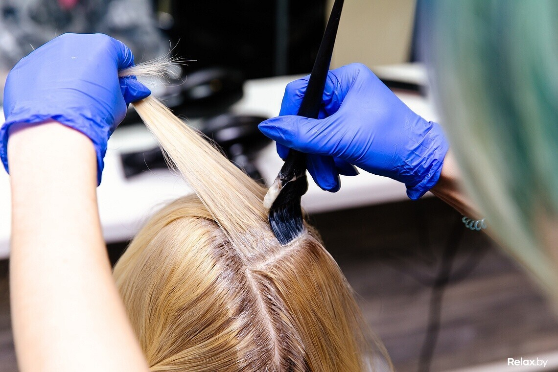 Следующий этап — осветление участка волос между прикорневой зоной и длиной. Стоит обратить внимание, что непосредственно кожу головы и прикорневую зону мы не затрагиваем: во всем мире такая практика запрещена. Осветляющие средства обычно имеют довольно агрессивные составы и могут сильно навредить.
