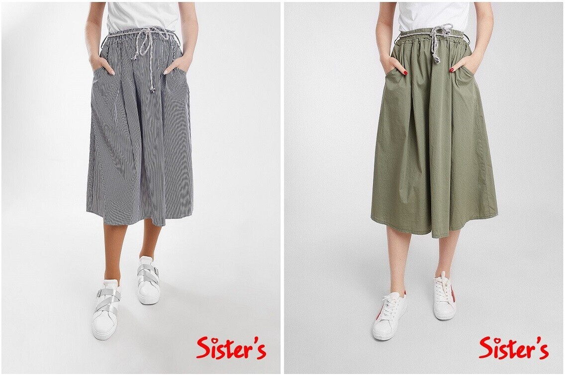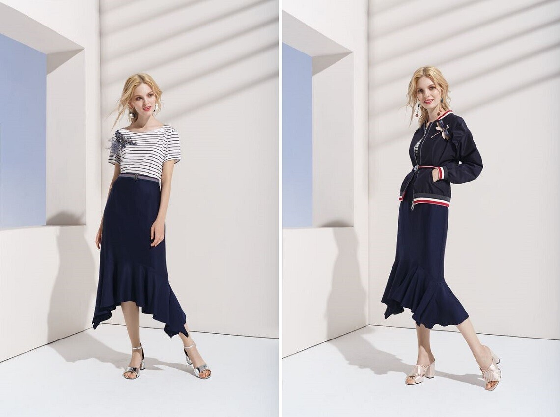 В магазинах бренда можно найти любопытную вариацию традиционной юбки-карандаш — в спортивном стиле с боковыми карманами. Модель выпущена в нескольких цветах: есть варианты от сдержанных пастельных до очень ярких. Такая модель отлично сочетается со спортивной обувью — то есть можно, не опасаясь, носить эти юбки с кедами и кроссовками. Есть и более «свободная» модель с акцентным поясом на талии в виде декоративного шнура. И, конечно, не обошлось без роскошных юбок-макси с контрастными ремнями в полоску или брутальных юбок-пачек, которые легко комбинируются в рок-образах.
