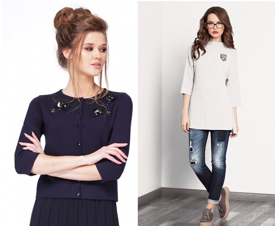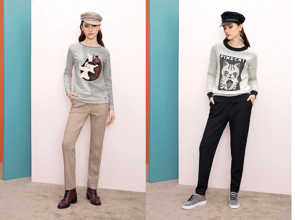 Nelva представила варианты с классической клеткой и полоской, а также забавными принтами и аппликациями на джемперах прямого силуэта в стиле casual. Любительницам более женственных вариантов стоит обратить внимание на теплые удлиненные модели с объемными накладными карманами.