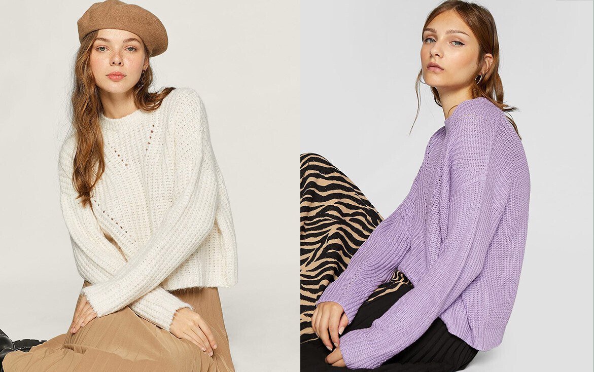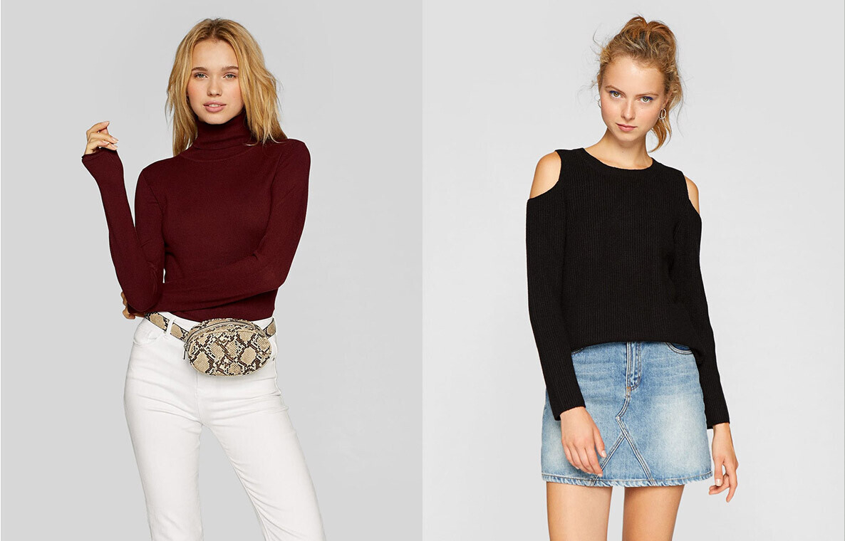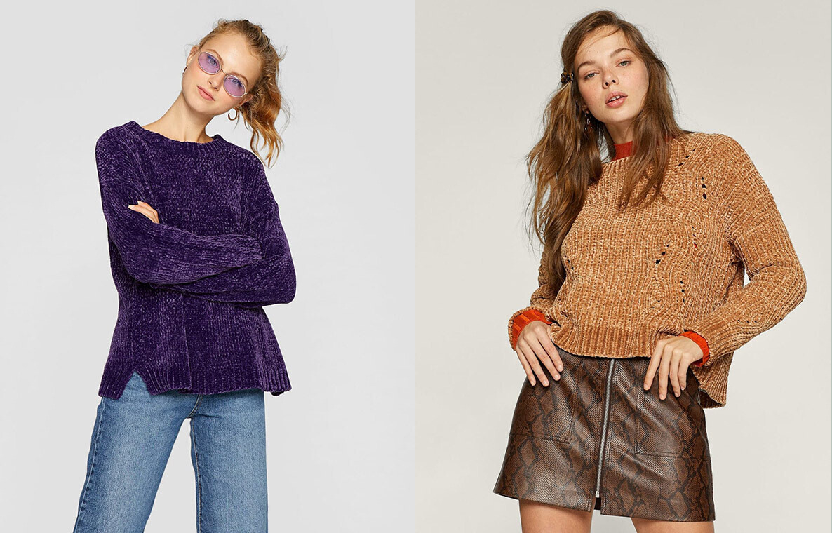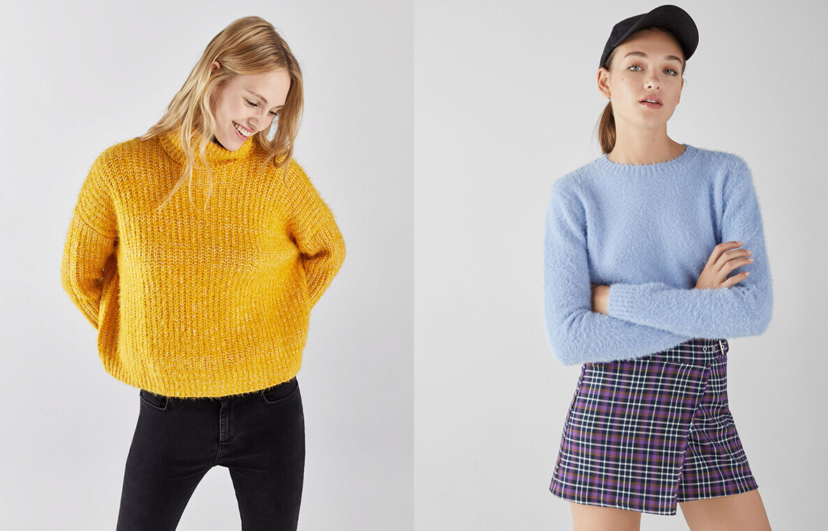 Один из самых теплых и уютных трендов этого сезона — свитера из бархатистой синели — представлен в разных расцветках в Stradivarius. Также здесь можно подобрать водолазку или укороченный oversize-джемпер, который гармонично дополнит образ с юбкой-миди.