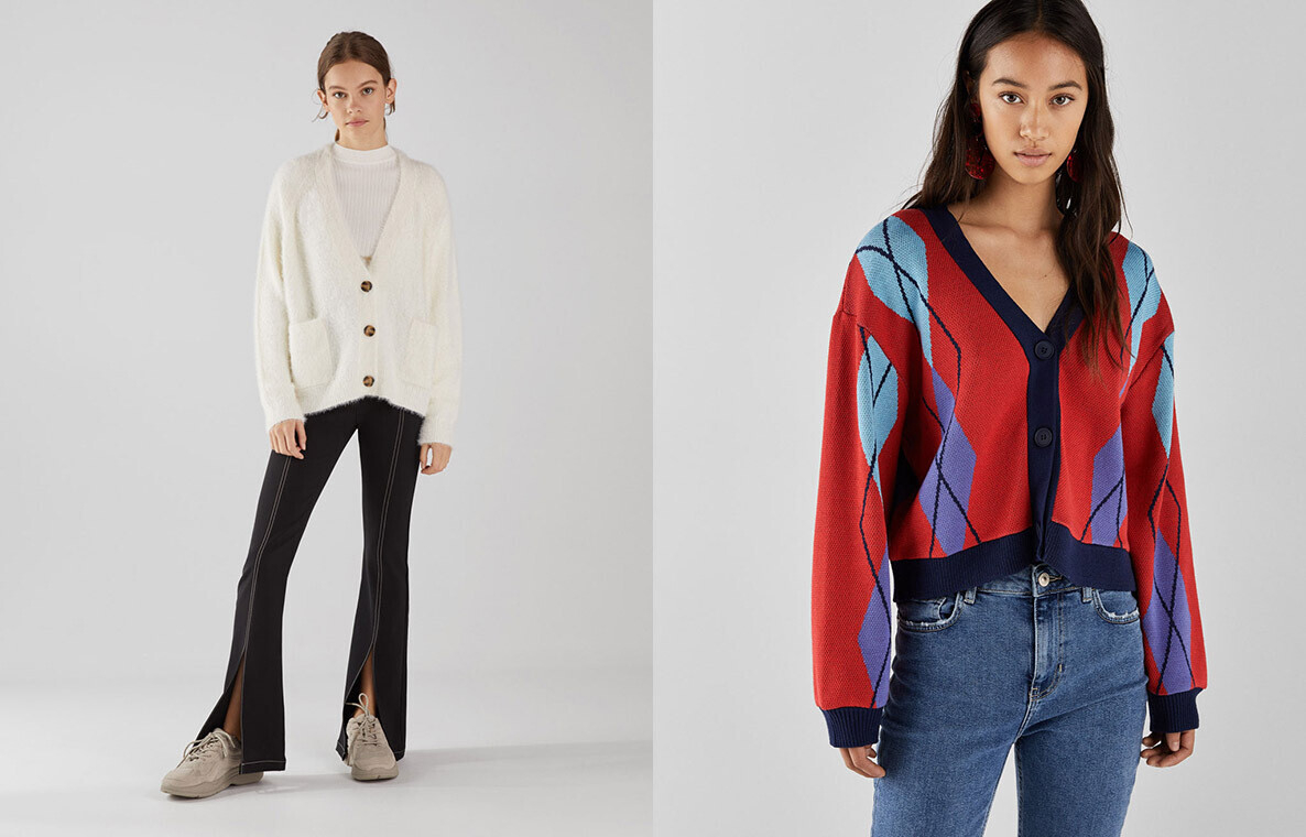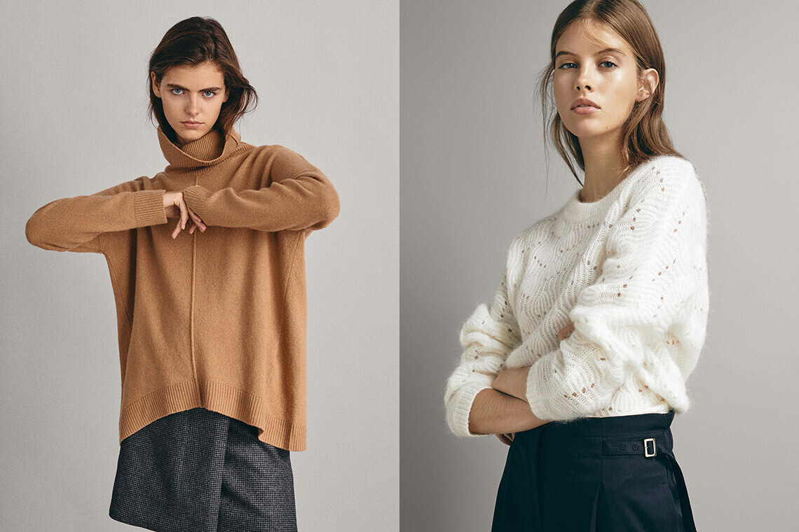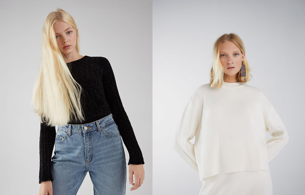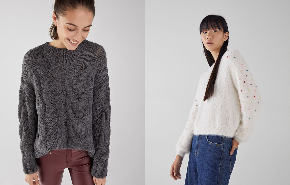 Один из самых теплых и уютных трендов этого сезона — свитера из бархатистой синели — представлен в разных расцветках в Stradivarius. Также здесь можно подобрать водолазку или укороченный oversize-джемпер, который гармонично дополнит образ с юбкой-миди.