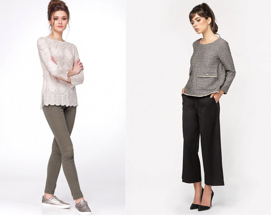 Активная контрастная полоска, открытые ключицы и излюбленный оверсайз — именно такие модели демонстрируют дизайнеры. Помимо классических однотонных вариантов, модницам предлагают подпоясать свитер, превратив его в тунику во французском стиле. А со стильными деловыми брюками светло-серого оттенка такие свитера можно легко превращать из повседневных в деловые и даже наряды для особых случаев.