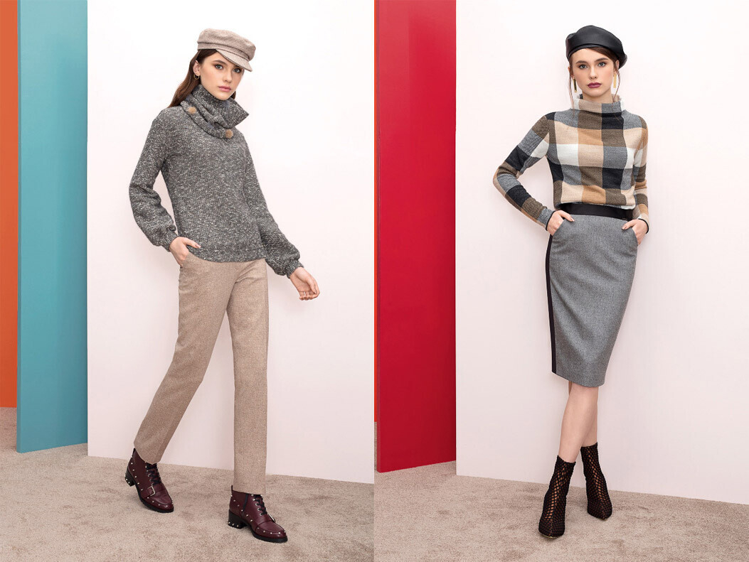 Бренд в этом сезоне предлагает широкое разнообразие моделей: от традиционных однотонных свитеров мелкой вязки, которые гармонично вписываются в любой базовый гардероб, до вариантов с контрасными орнаментами и декоративной перфорацией. Лукбук подсказывает, что носить такие свитера будет уместно не только с брюками, но и с юбками, даже в деловом стиле.