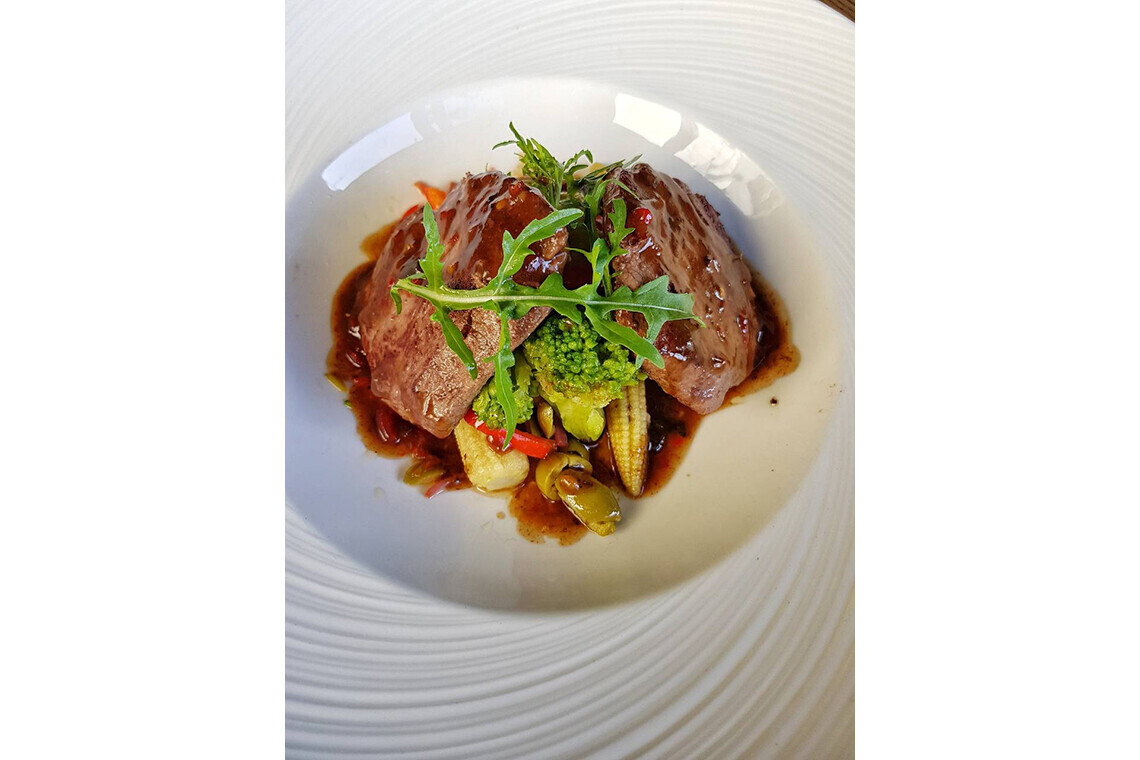 Говяжья вырезка готовится в мисо-пасте при низкой температуре в течение 2,5 часа. Брокколи и початки мини-кукурузы быстро обжариваются до состояния al dente на хорошо раскаленной сковороде. Блюдо дополняют вяленый свиной окорок и пикантный соус из оливок и маслин.