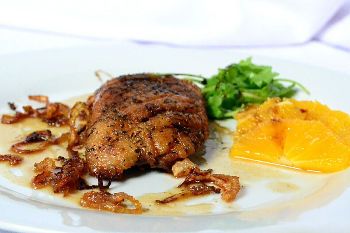 Куриное филе отбивается, после чего фаршируется тонко нарезанными ломтиками бекона с грибами шиитаки. Затем закручивается в виде рулета и обжаривается. Разрезанный на две части рулет поливается сливочно-ягодным соусом с коньяком. Подается с микс-салатом, томатом черри и розмарином.