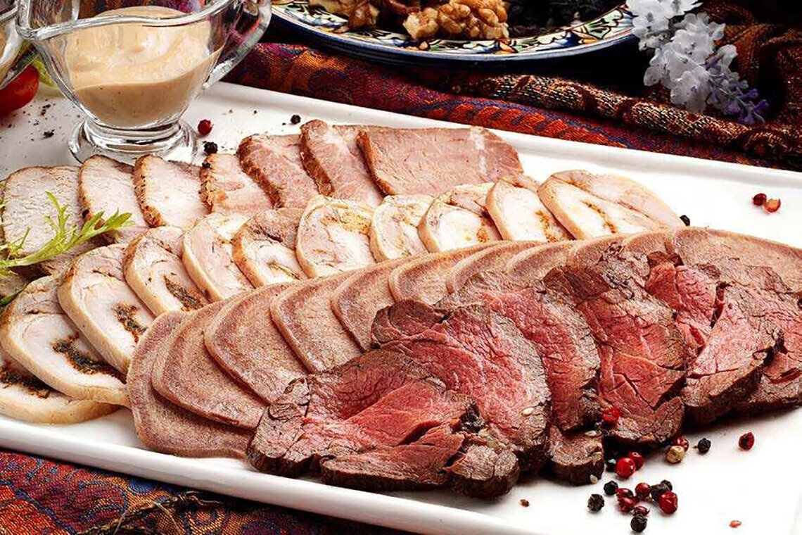 В составе блюда — пячисто из оленины, руляда из птицы, рулет домашний из ушей, язык отварной, хрен и зелень. Все закуски приготовлены по-домашнему и так, как видят их настоящие охотники. Блюдо подается на деревянной тарелке с зелеными листьями салата.