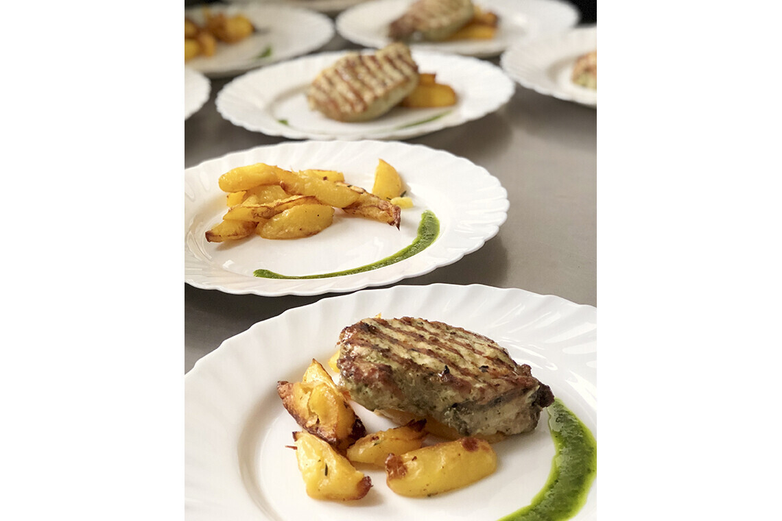 Свиную корейку в заведении запечатывают на гриле до золотистой корочки, затем доводят в печке до готовности. Так мясо получается максимально сочным. Особый вкус рецепту добавляют базилик, чеснок, оливковое масло и пармезан. Рекомендуется заказывать с пряными картофельными дольками: тимьян и розмарин придадут основному блюду неповторимый аромат.