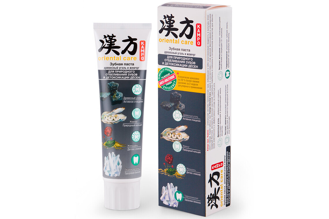 Паста на основе древесного угля и экстракта жемчуга серии KAMPO Oriental Care — это древняя японская система сочетания природных компонентов. Древесный уголь бережно очищает поверхность зубов, возвращая им естественную белизну, блокирует неприятный запах и сохраняет свежее дыхание в течение 6-8 часов. Имеет травяное послевкусие.