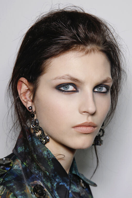 Еще один вариант — «капля» синих теней на внутреннем уголке глаза. На губы лучше нанести нейтральную помаду, которая не будет вступать в диссонанс с синими тенями.