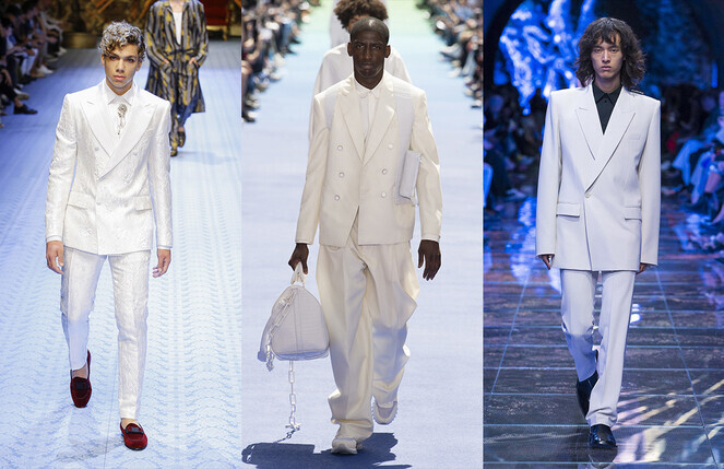 Белые костюмы «как на свадьбу» станут трендом в следующем году. Классика снова в моде! Белый костюм — идеальное выражение шика. По крайней мере, так решили Louis Vuitton, Dolce & Gabbana и Zegna. Белый костюм особенно хорошо подойдет обладателям смуглой кожи и любителям выделяться. Правда, нужно учесть, что такие вещи требуют особенно бережной носки и специального ухода.
