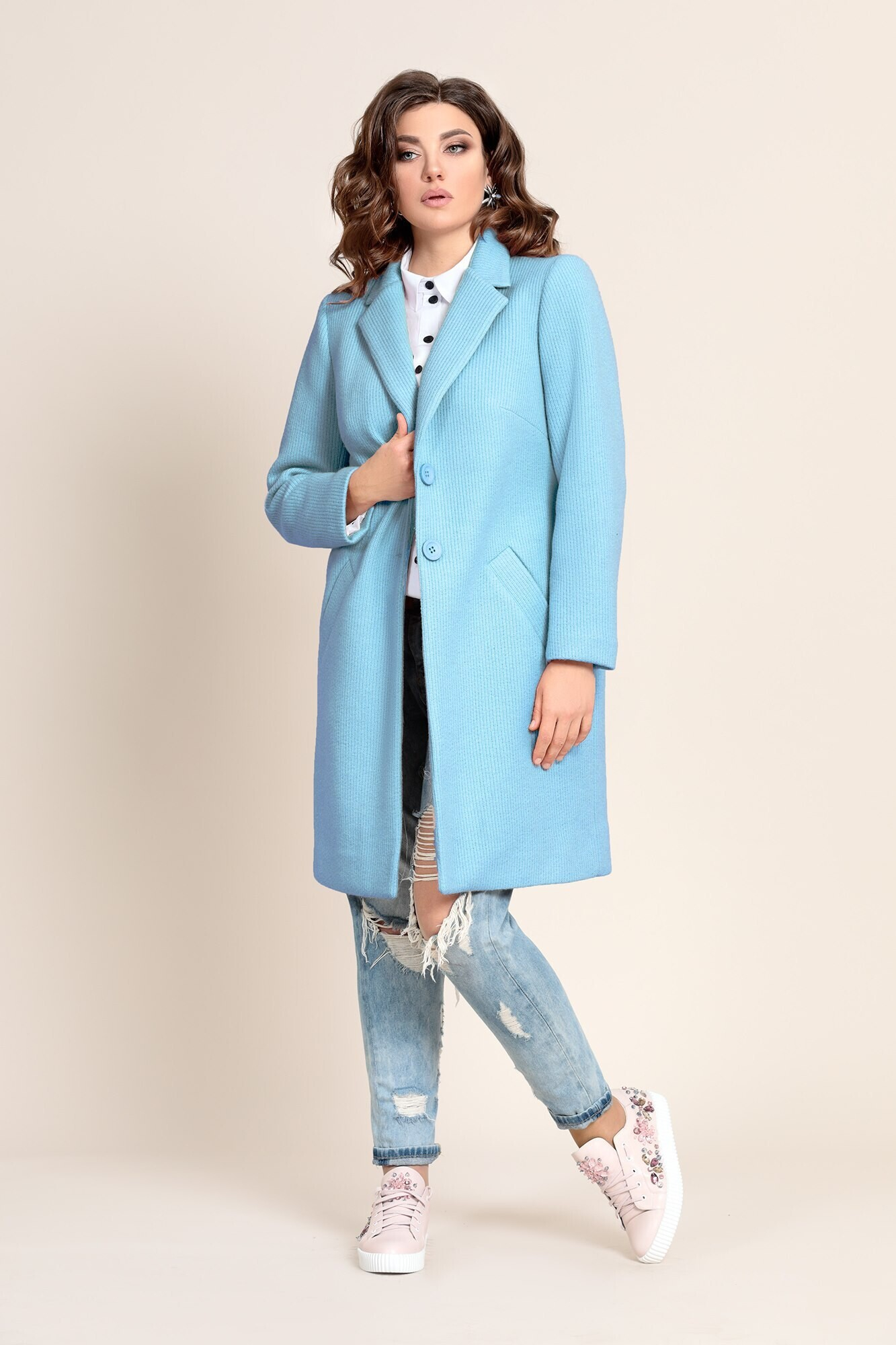 После серого и пасмурного окончания зимы захочется ярких красок и легкости. Пальто небесно-голубого цвета с длиной до колена может стать источником хорошего настроения, вписываясь в формат города.