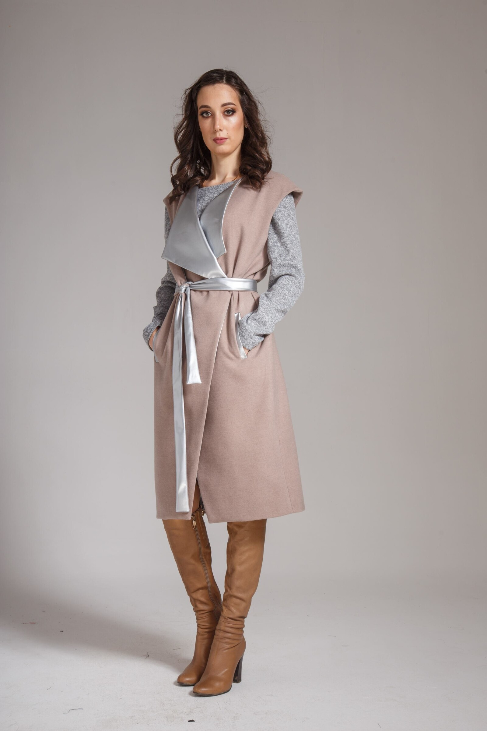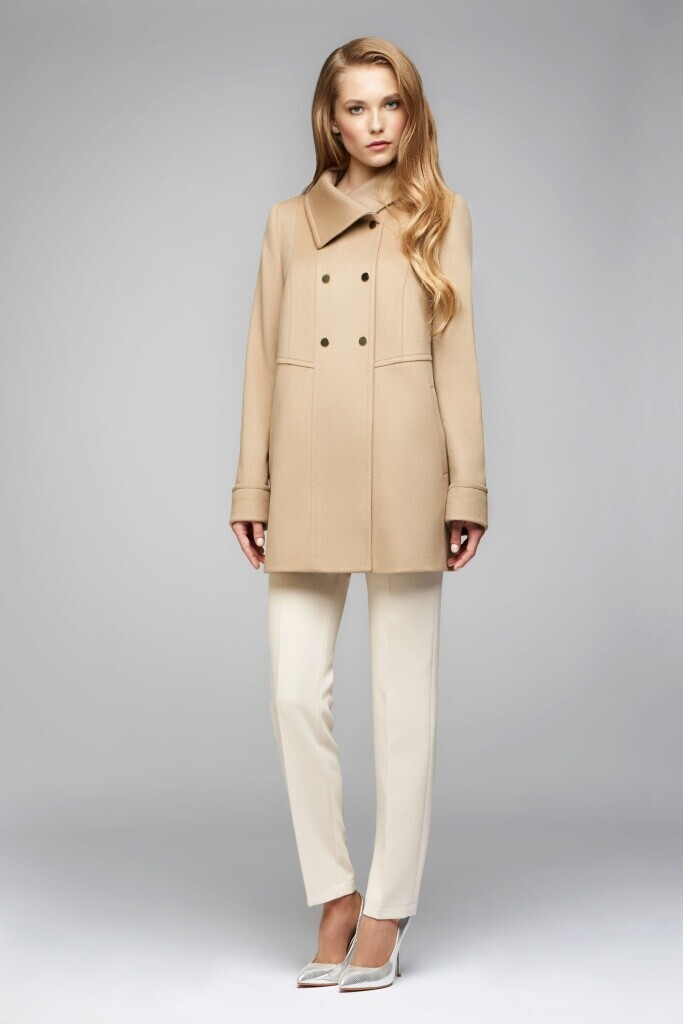 В материале верха 70% шерсти, 20% ПА и 10% кашемира. В наличии можно увидеть полупальто в нескольких расцветках: бежевая, терракот и вишня.