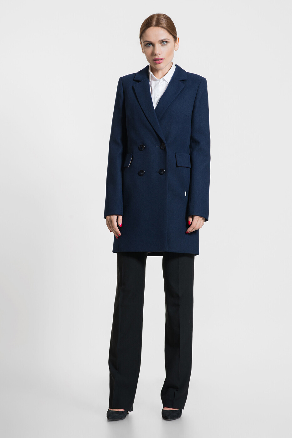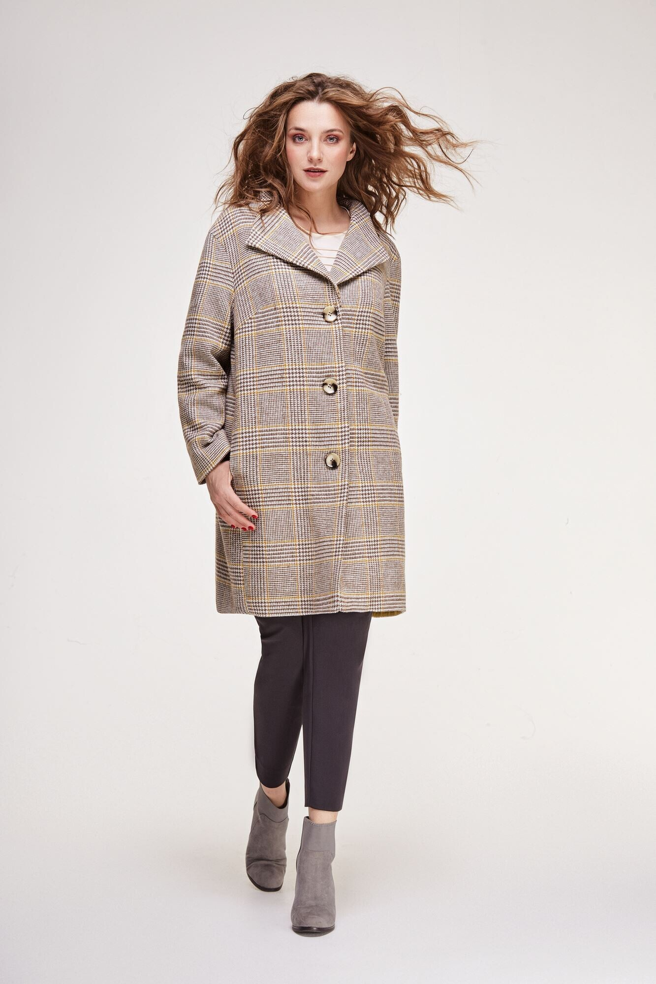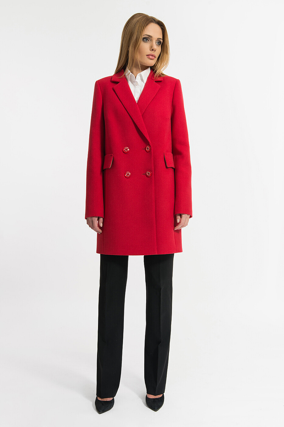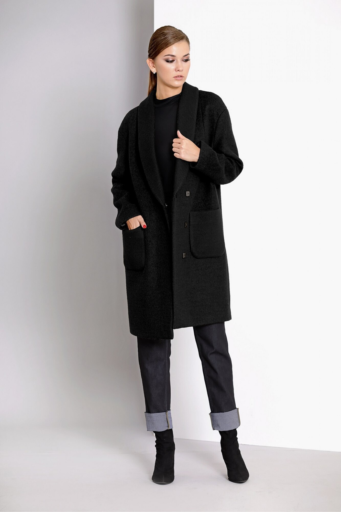 Прямой крой пальто «вытягивает» силуэт, а двубортность и массивные карманы добавляют изящества.