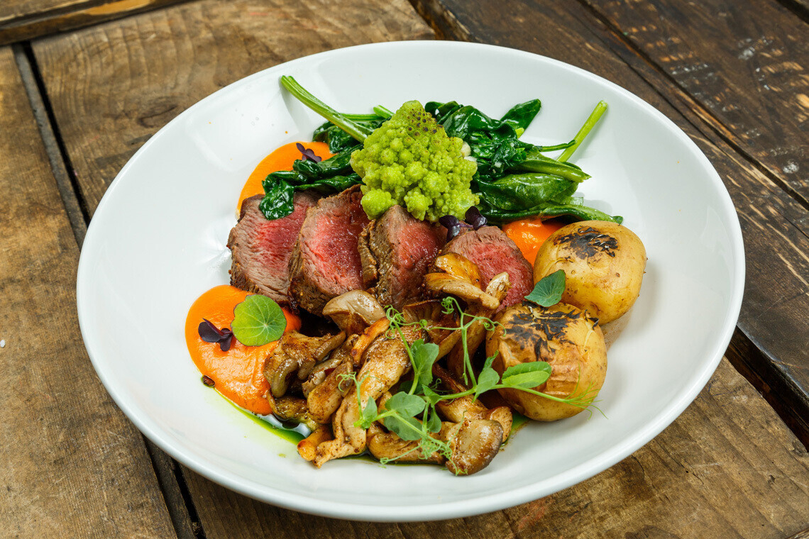 Что заказать: ящик холодных закусок, ящик горячих закусок, мясо на рогах, фирменное блюдо — говядину «Веллингтон»