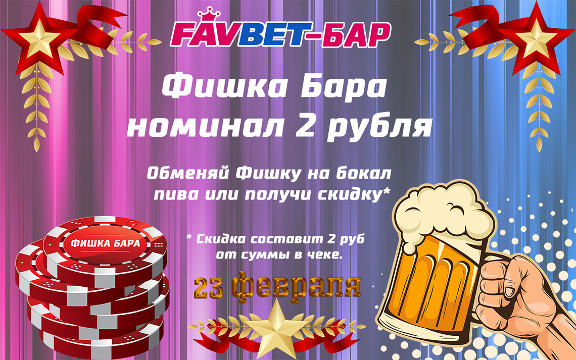 23 февраля в заведении можно будет собраться мужской компанией и посмотреть матч Севилья — Барселона за бокалом пенного напитка. Каждому гостю в этот день полагается фишка номиналом 2 рубля, которую можно будет обменять на угощение в баре.