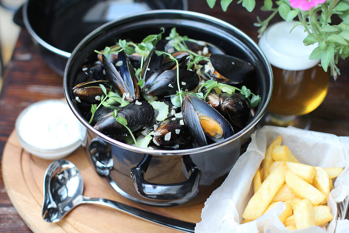 Что заказать: мидии, большую бельгийскую закуску, свиные ребра в карамельной глазури, салат с тунцом