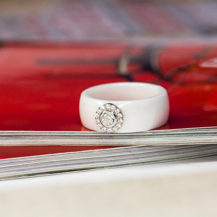 Кольцо из белой керамики со вставкой из серебра и фианитов.