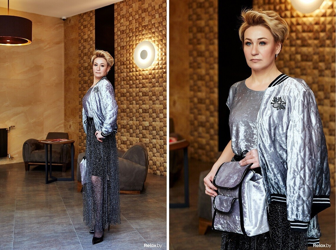 — Когда мы искали одежду со стилистом, я была уверена, что мы остановимся на чем-то очень женственном. Ожидала платьев в цветочек, кружева, тысячи оттенков розового. Но поняла, что женственность зачастую выражается не в этих клише. Примерив на себя образ с серебристым бомбером, я поняла, что это — мое! Сразу почувствовала себя моложе и бодрее — а ведь это именно то ощущение, которого мне хотелось. Я готова была прямо сразу из магазина уйти в этом наряде, даже не важно куда, — смеется наша героиня.