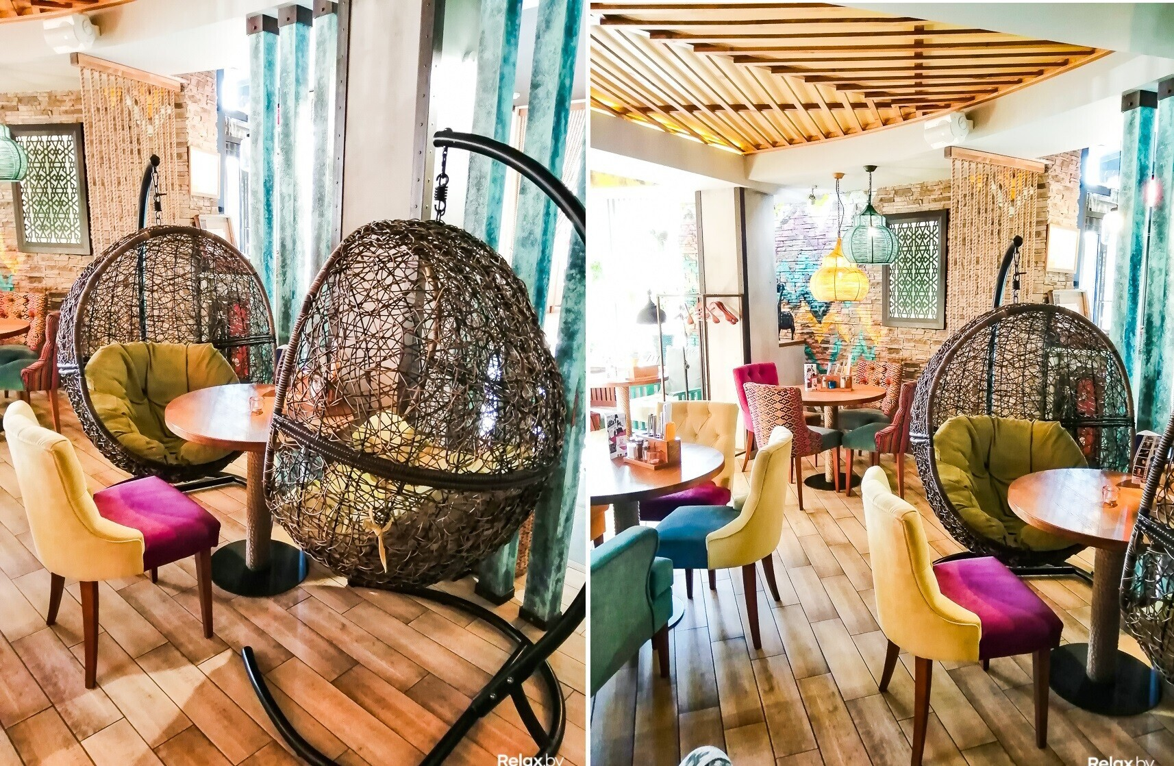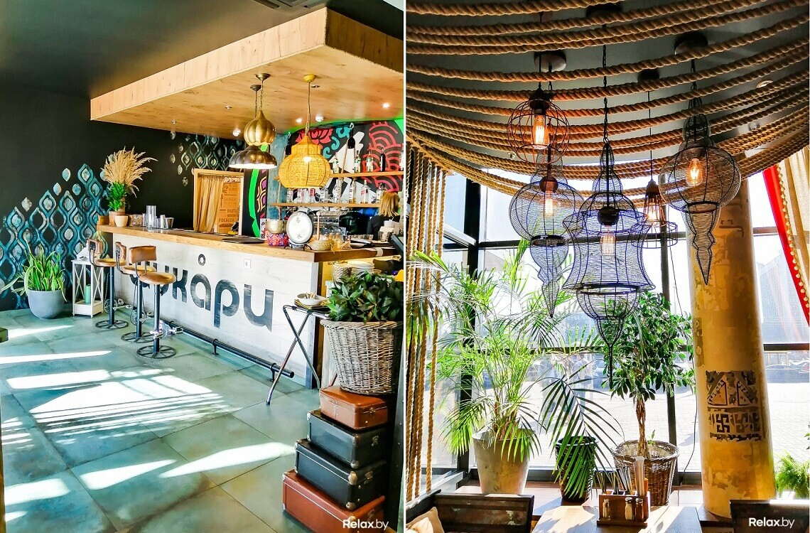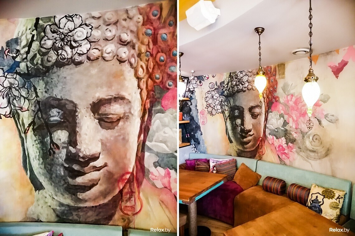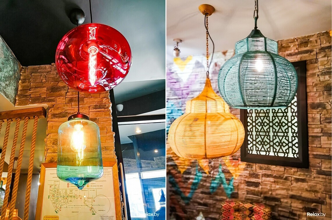 Помимо этого, интерьер заведения богат необычными цветными и плетеными люстрами, яркой акцентной мебелью и невероятно атмосферными деталями вроде потемневших от времени вентилей и кранов, ретрочемоданов и художественной росписи на стенах. Особенно понравится тем, кто интересуется восточной культурой и вдохновляется яркими красками.