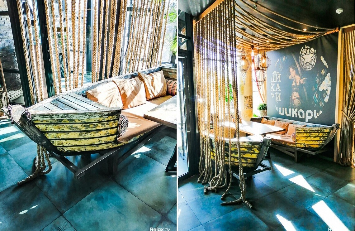 Поначалу интерьер этого места может показаться слегка безумным. Но именно в этом его особая прелесть. Брутальные канаты, состаренная «рыбацкая» лодка — уже отличный реквизит для снимка.