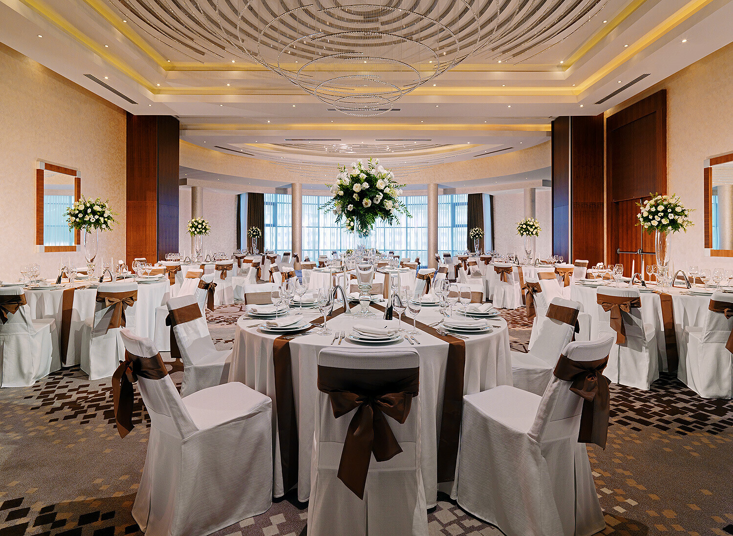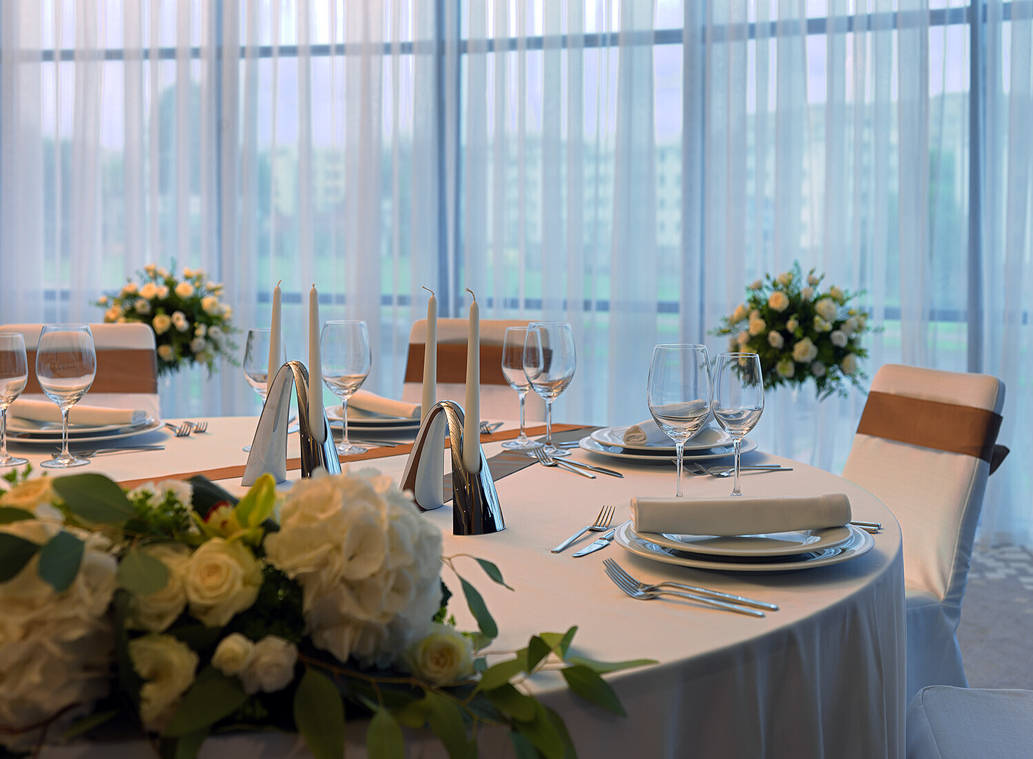 Любовь: Удобно, когда пространство можно трансформировать и делить на зоны. Например, в отеле «Ренессанс» есть большой бальный зал, который при максимальной посадке рассчитан на 250 человек. Если молодожены решили организовать небольшое торжество на 30-50 человек, зал можно легко трансформировать под отдельные зоны с помощью перегородок. У нас был опыт, когда мы закрывали часть зала с окнами, чтобы создать в помещении полумрак. Организаторы выложили для молодоженов дорожку из зажженных свечей, было очень красиво.