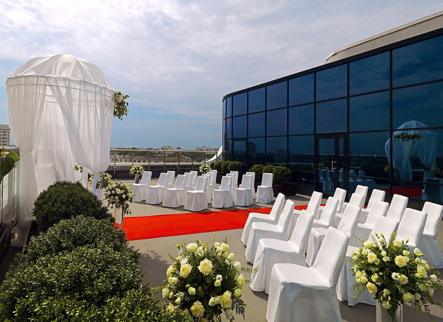 Ольга: В отеле есть площадка на крыше, где регулярно проходят свадебные регистрации и фуршеты. В прошлом году на крыше отеля прошла необычная свадьба, где были организованы разные зоны активации, в том числе — X-Box и настольный футбол. По периметру пространства была установлена подсветка, выглядело все это очень эффектно.