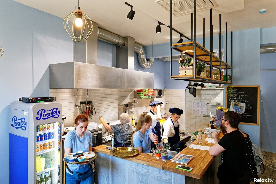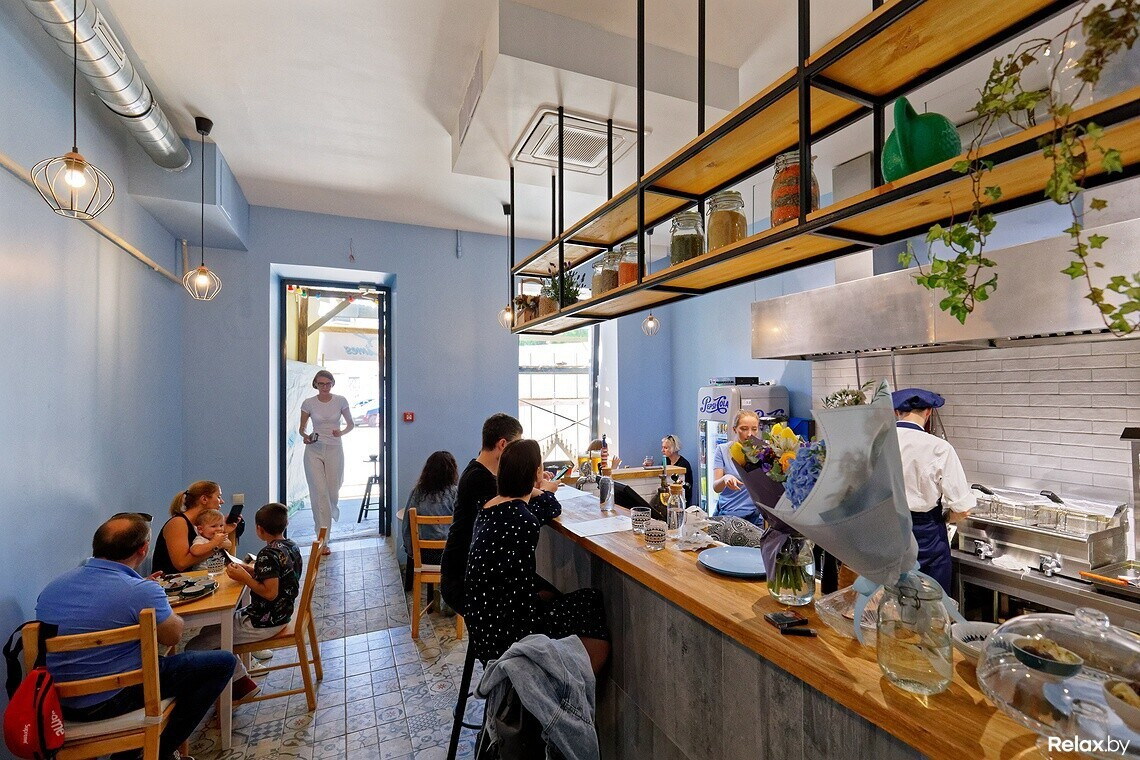 Молодая владелица Валерия Суровцева всю сознательную жизнь работает в сфере гостеприимства. Идея открыть собственное кафе пришла к ней около года назад: девушка вдохновилась питерскими заведениями с израильской кухней — Bekitzer, Babaganoush, Meshuga Grill. Шеф-повар последнего в результате помогал в реализации идеи в Минске. В небольшом помещении на Карла Маркса открытая кухня. Дизайн от Галины Сорокиной максимально лаконичный: акцент на светло-голубые стены и деревянную мебель. В меню так называемый «кошер-стайл», в кафе четко разделяют израильскую и еврейскую кухни.