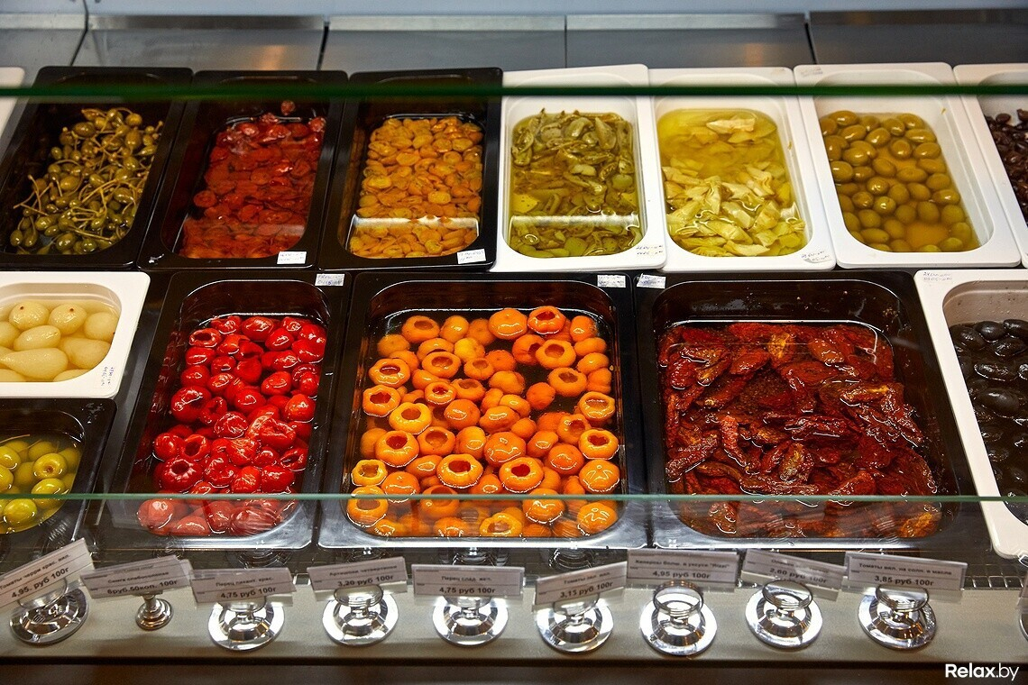 Основная география вин в магазине — Испания, Италия, Франция. Цены от 10 до 200 рублей за бутылку. Средняя порция салата обойдется в 5-8 рублей, стоимость любой из закусок за 100 граммов — от 3 рублей. Можно выложить закуски на тарелку либо «собрать» салат или круассан.